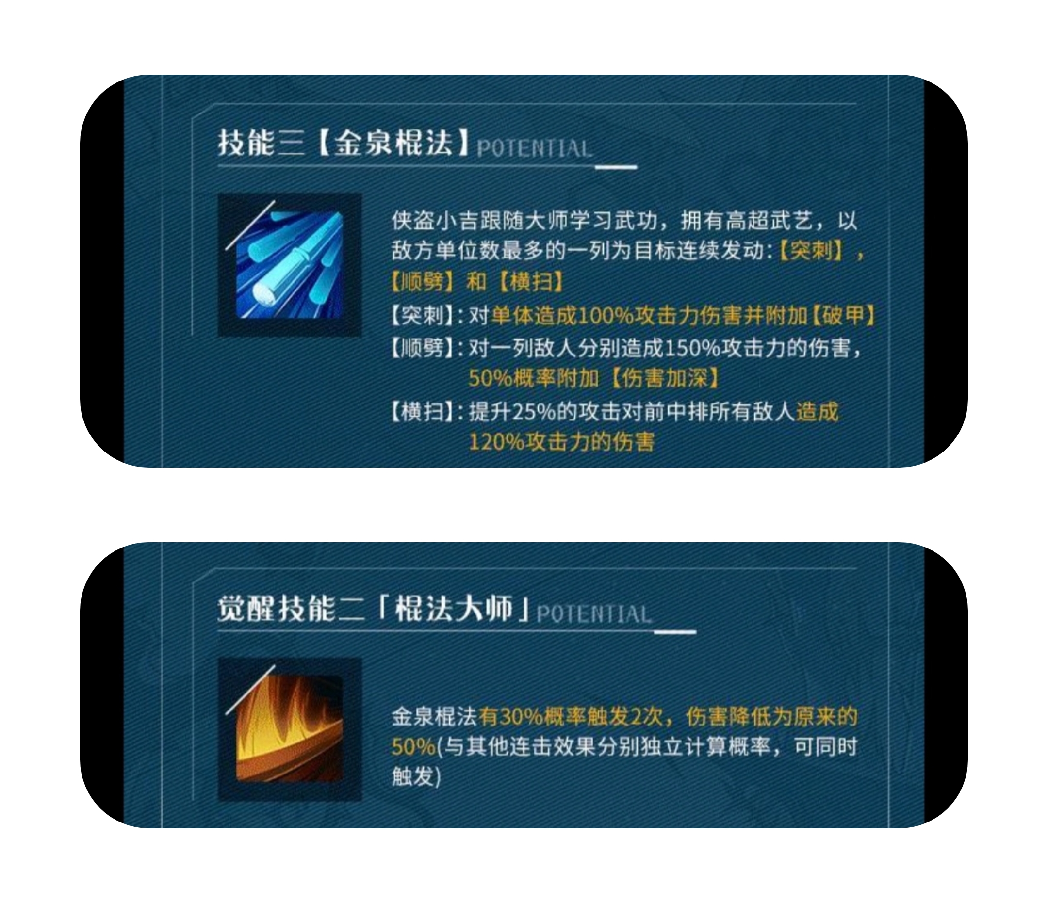 觉醒技能二:自带大招连击(30%概率),提高了自身上限,增强输出能力。