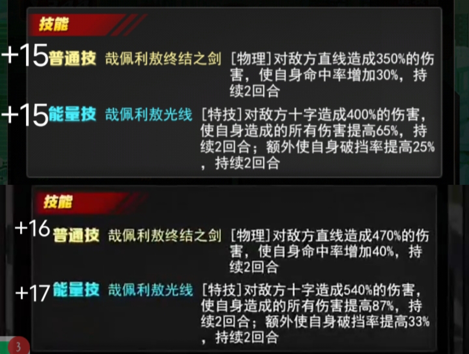 +17能量技 哉佩利敖光线[特技]对敌方十字造成540%的伤害,使自身造成的所有伤害提高87%,持