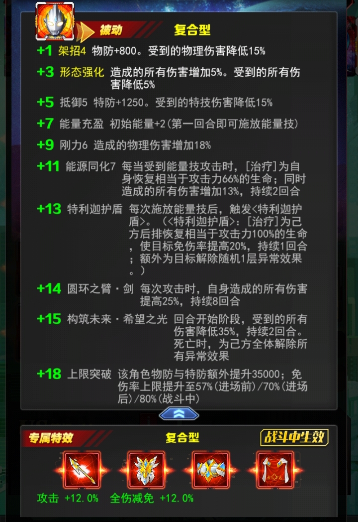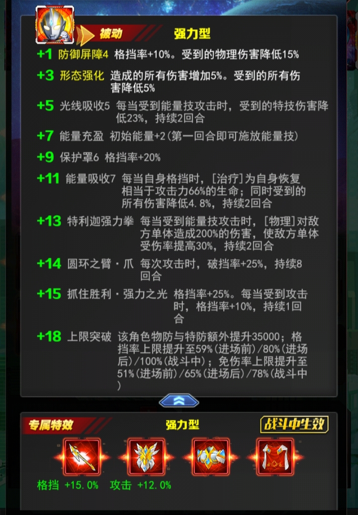 +13特利迦强力拳每当受到能量技攻击时,[物理]对敌方单体造成200%的伤害,使敌方单体
