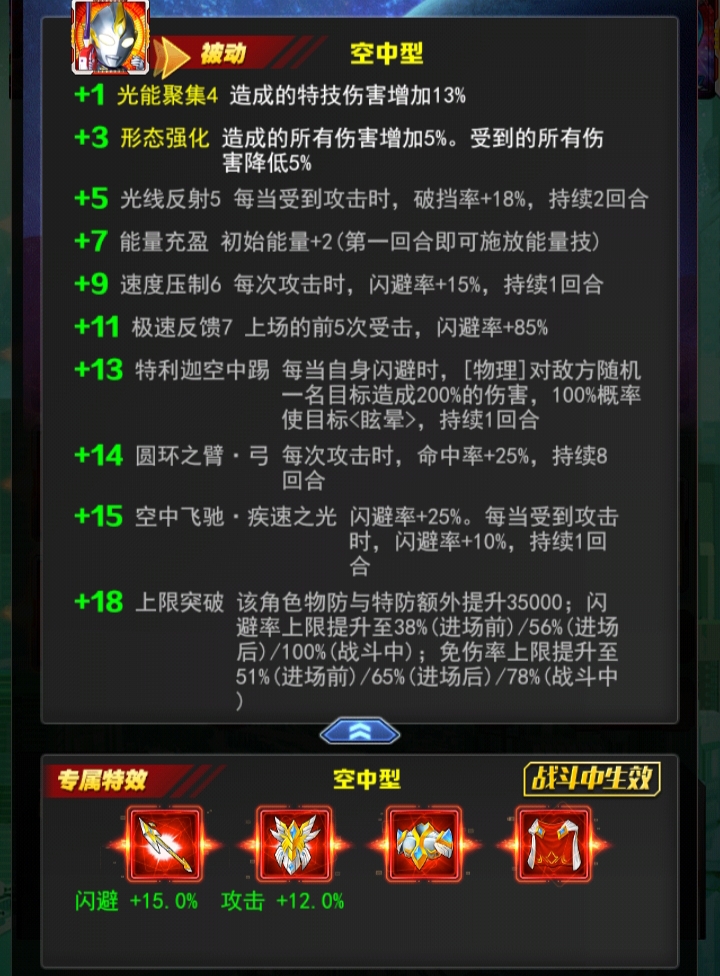 能量技能解析:后排单体高比例伤害,有高比例伤害的二段有迪迦呢味了,闪避也能打过降低命中,伤害也不错挺强的