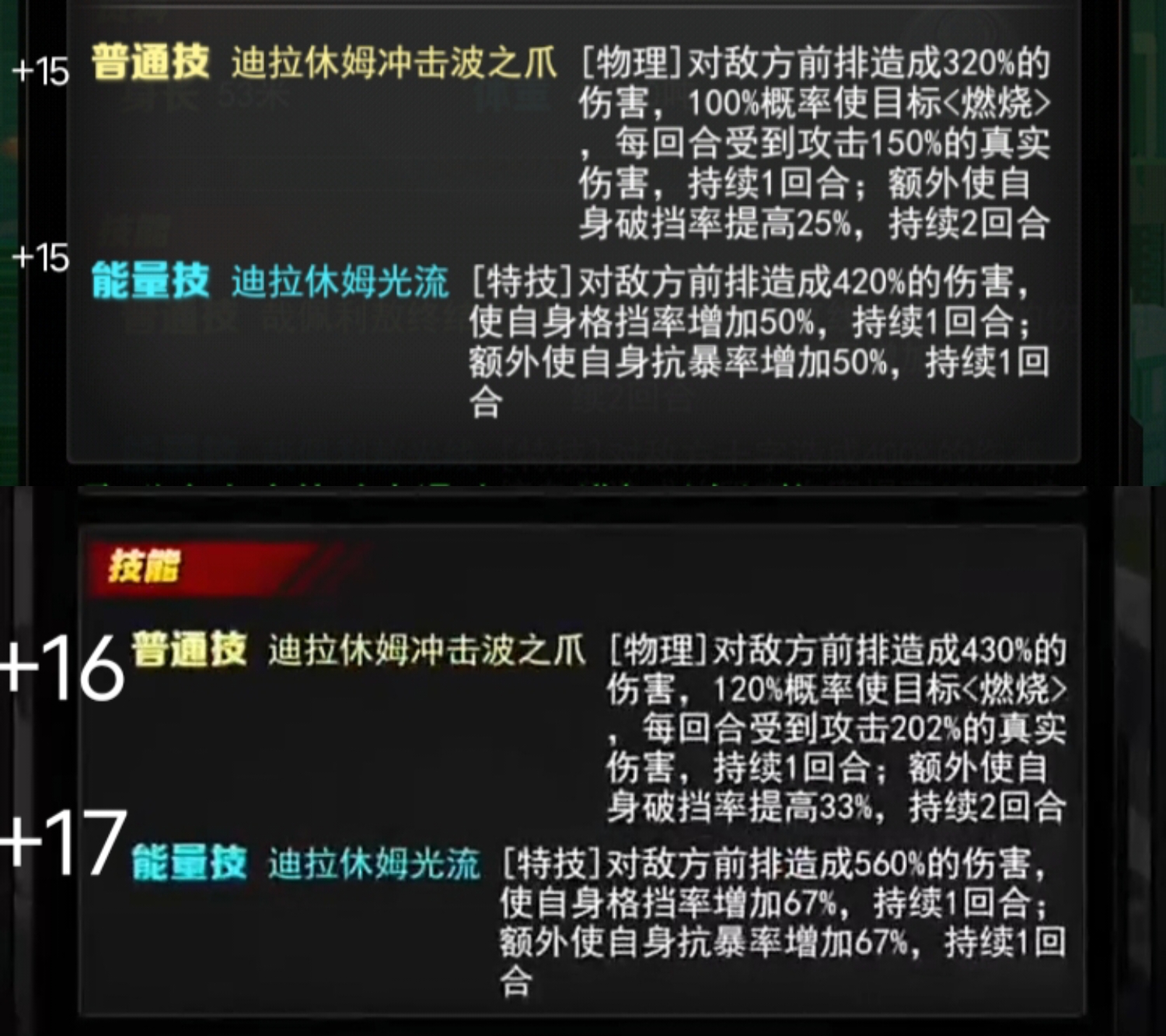 +16普通技迪拉休姆冲击波之爪[物理]对敌方前排造成430%的伤害,120%概率使目标<燃烧>