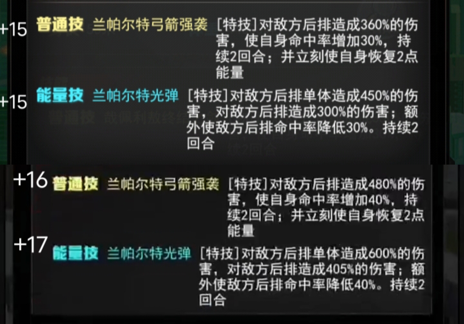 +16 普通技 兰帕尔特弓箭强袭[特技]对敌方后排造成480%的伤害,使自身命中率增加40%,持