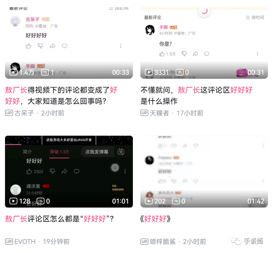刷了一会敖厂长视频的评论,手谈姬就接着去写游戏推荐了,写完后大概七点多,又看了一眼敖厂长那边,热评几乎是以好评为主,于是不自觉地点开了“按时间”排序,却看到清一色的“好好好”,有种机器人般的协调感,看来是控评了。