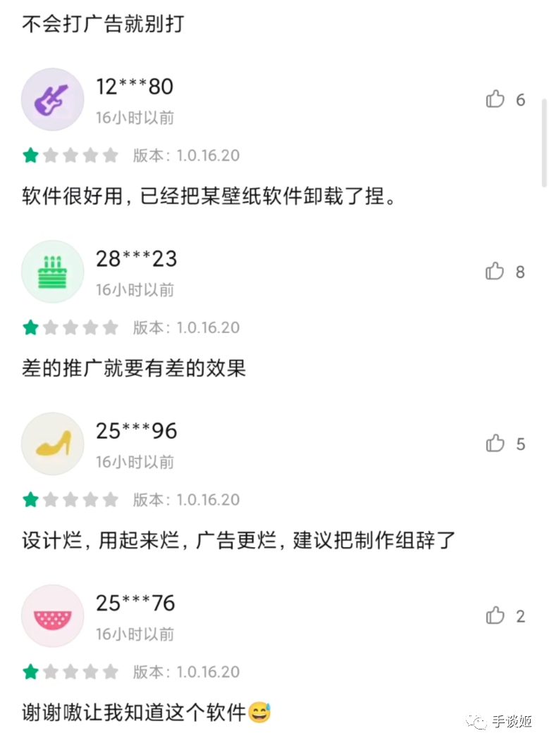 另外一个可能的原因是,作为一个APP推广的商单,视频并未起到良好的宣传效果,反而是激起了不少人去给这个“懒设计”APP打差评,可以说完全是反效果了。