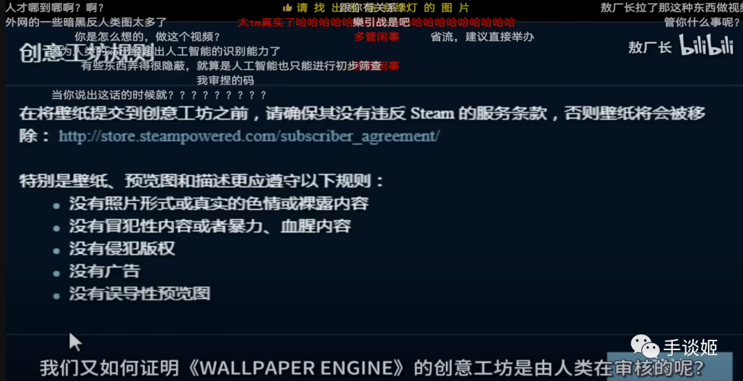 姬的理解是:敖厂长先介绍了wallpaper engine,讲其中有年龄分级的选项,又说它其实有自己的创意工坊规则,意味着wallpaper engine是需要人工审核的,于是敖厂长(表演出)心想,这种审核工作多半会给工作人员造成些阴影,就不能让ai来代替工人吗?于是厂长找到了(表演出)懒设计APP的公司,了解他们的审核机制,(其中夹杂了一些甲方非得让讲的废话),就结果来看,原来懒设计也是得人工审核的,审核人员不容易,视频结束。