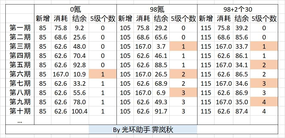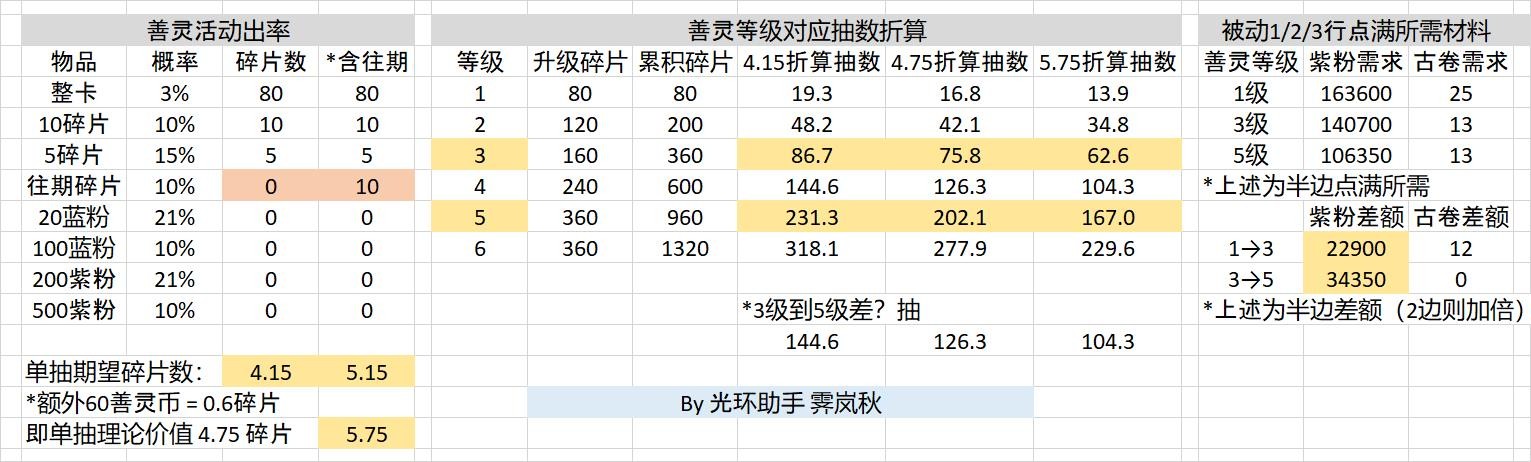 在有了所有善灵之后,同样以最高效地升级被动为首要目标,此时目标自然是3级和5级提供的额外被动等级。参考右边表格的“紫粉差额”以及中间表格的“所需抽数”,可以得出“1→3”性价比高于“3→5”,即3级优先级高于5级。