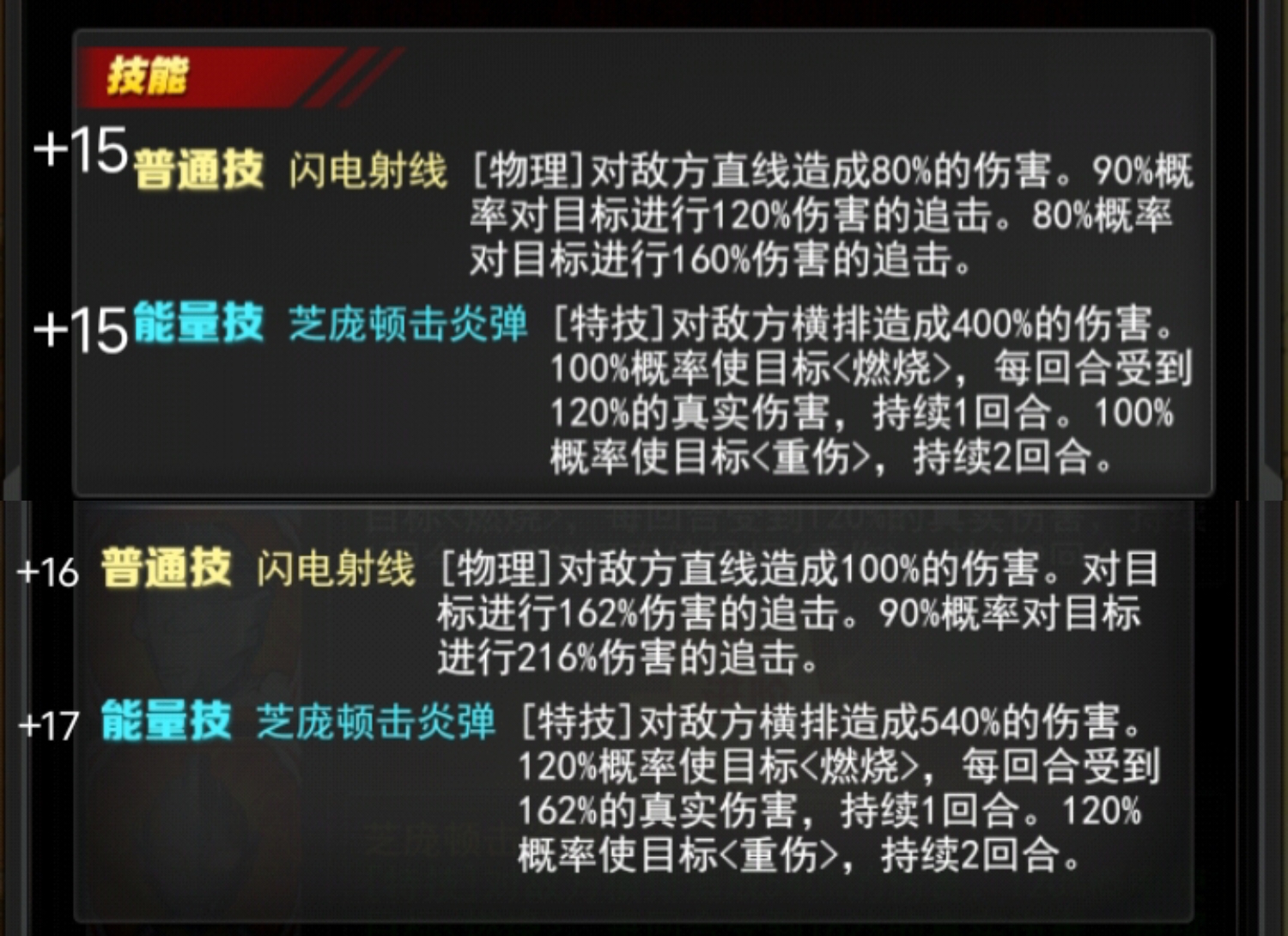 +17 能量技 芝庞顿击炎弹[特技]对敌方横排造成540%的伤害。120%概率使目标<燃烧>,每回合受到162%的真实伤害,持续1回合。120%