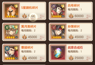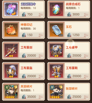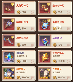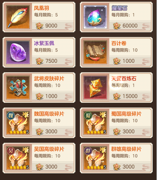 主要兑换:耀星石、凤凰羽、武将皮肤碎片等