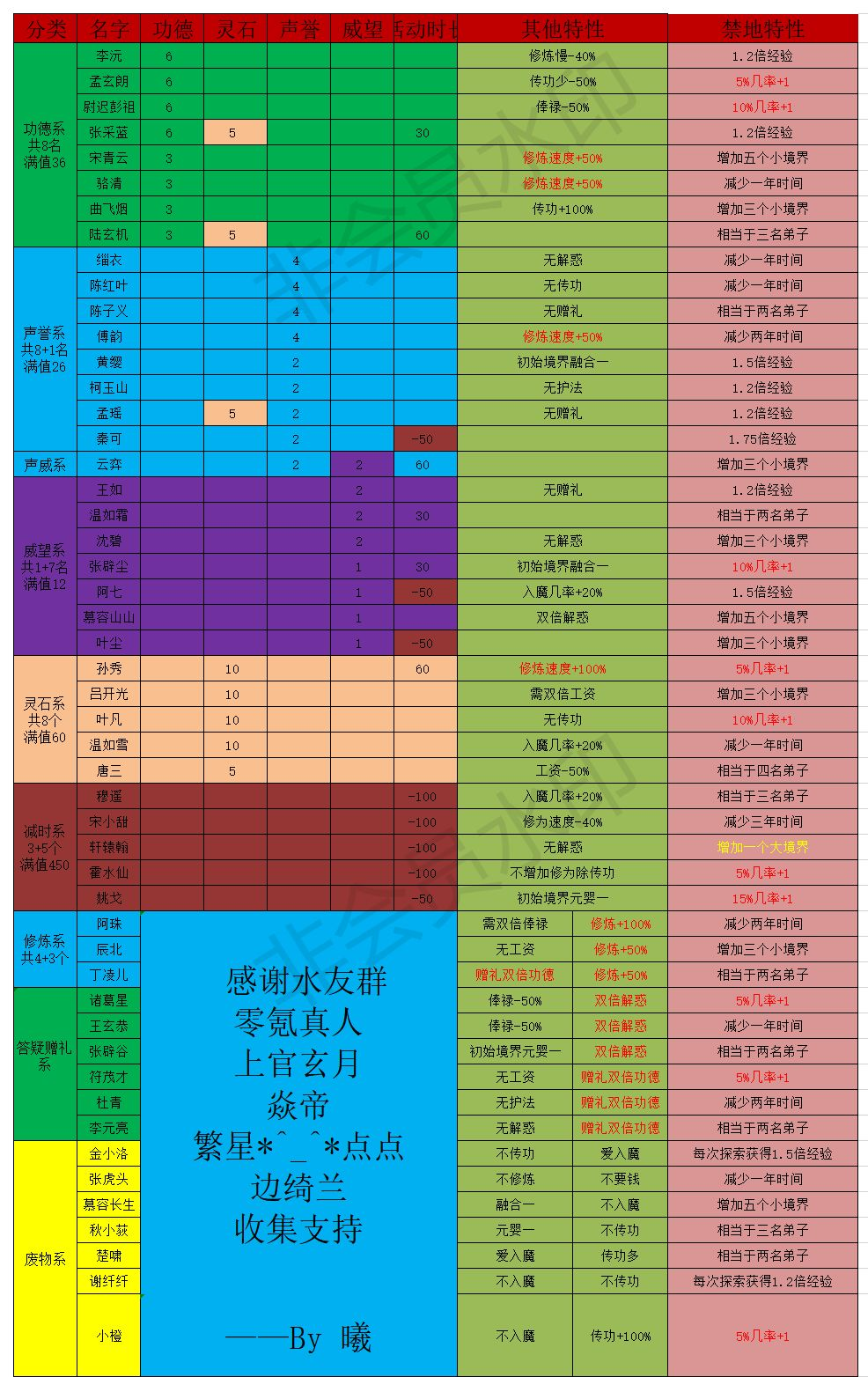 到天上以后,选好山头建立宗门(疯狂暗示十区萌新来王屋洞),建完宗门后先去“弟子院”招募弟子,上天前最好带2.5万灵石上天,因为招一个弟子要5000灵石,一天能招五个。(附赠弟子属性图)