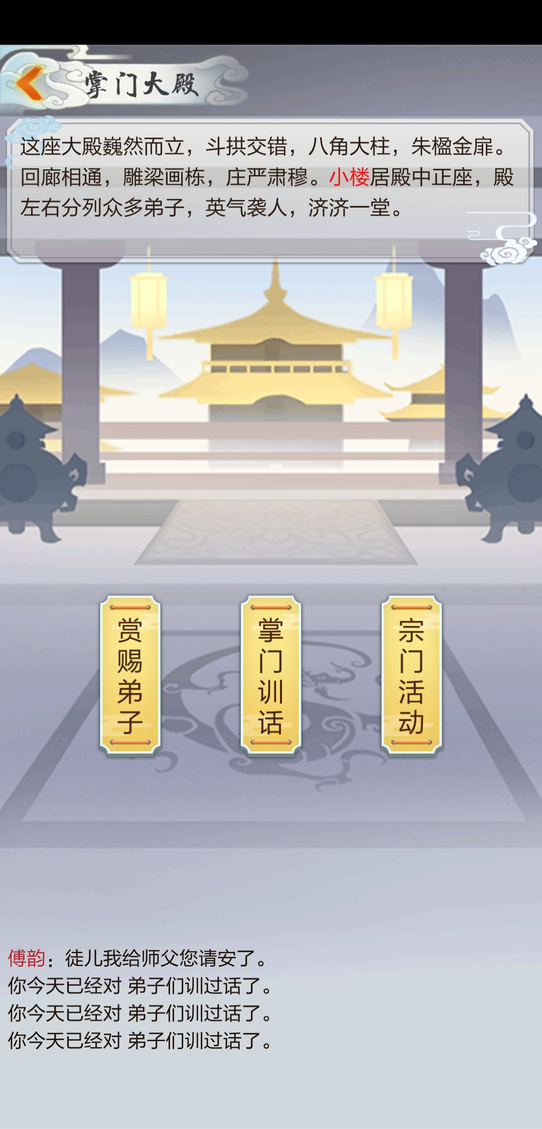 “训话”和“赏赐”都在“掌门大殿”里,完成后点开“宗门活动”开始挂任务。