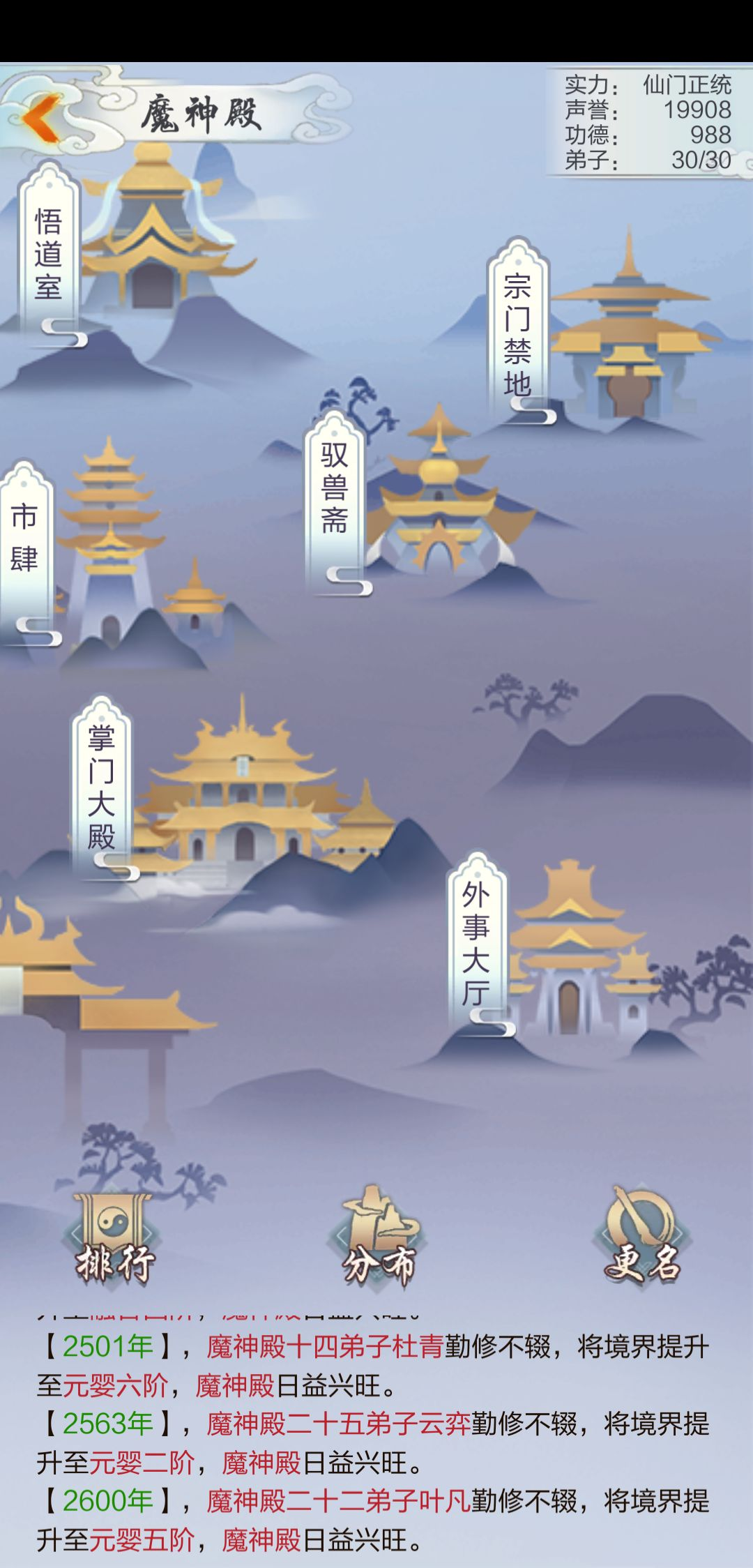 提示:无论弟子属性有多*,在弟子数量没招满之前,不要遣散!等弟子数量达到上限,再考虑更换一些*弟子。)