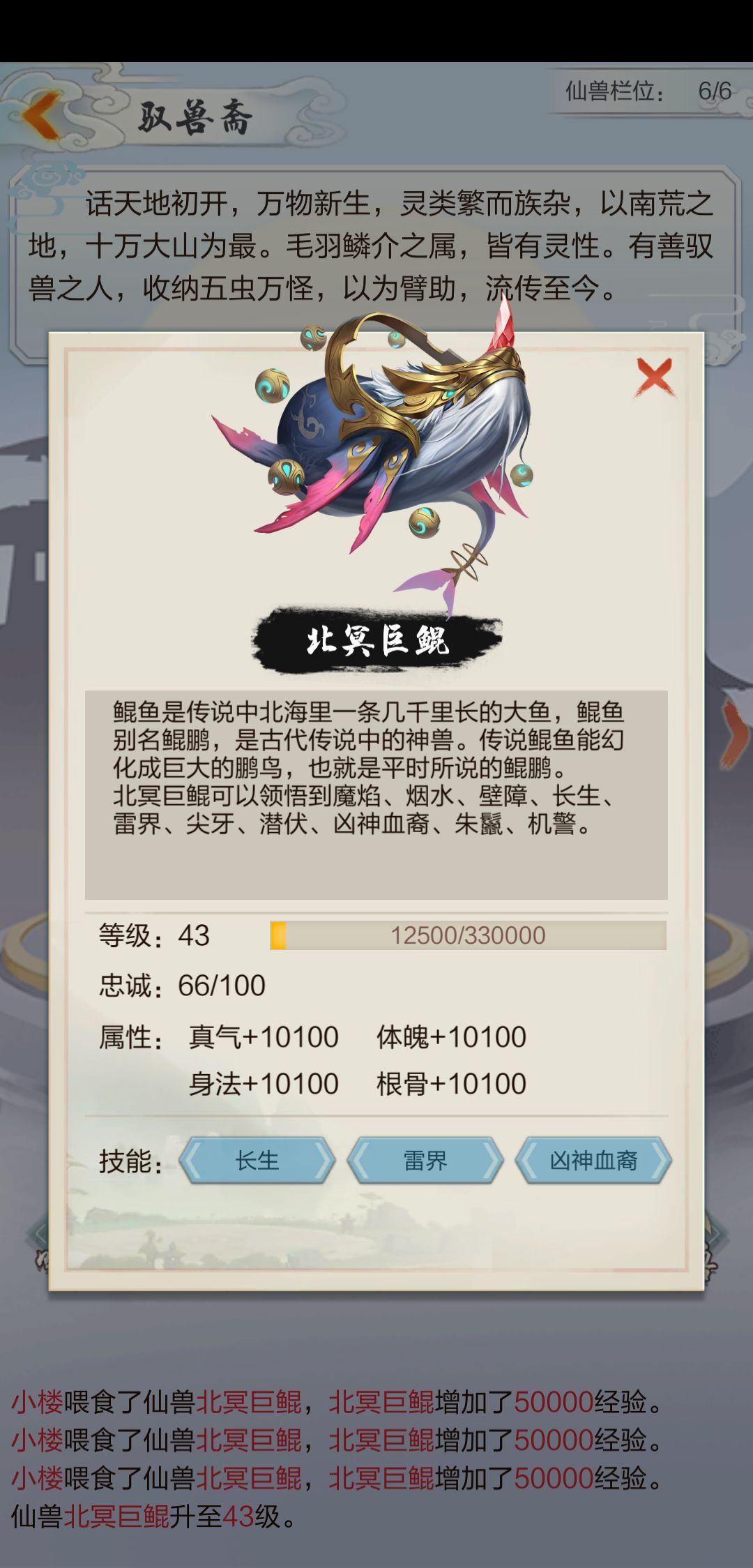 这时候,你声誉基本够建立驭兽斋了,打开背包看看有没有鲲,如果有就可以用了,然后去驭兽斋点“骑乘”,仙兽升级的经验丹和领悟技能的物品在魔域中兑换。