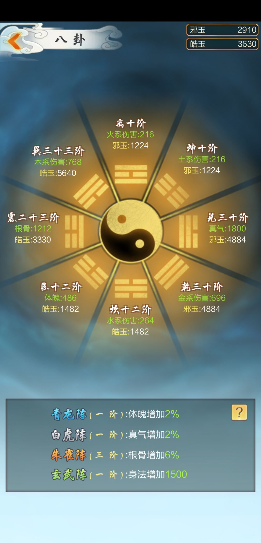 后面说说八卦阵,八卦阵由五行属性和真气、根骨、体魄八个属性构成,能结合出四种大阵,根骨区主升朱雀阵,这也是皓玉和邪玉的用处。(想要看阵法构成,就点右下角的问号)