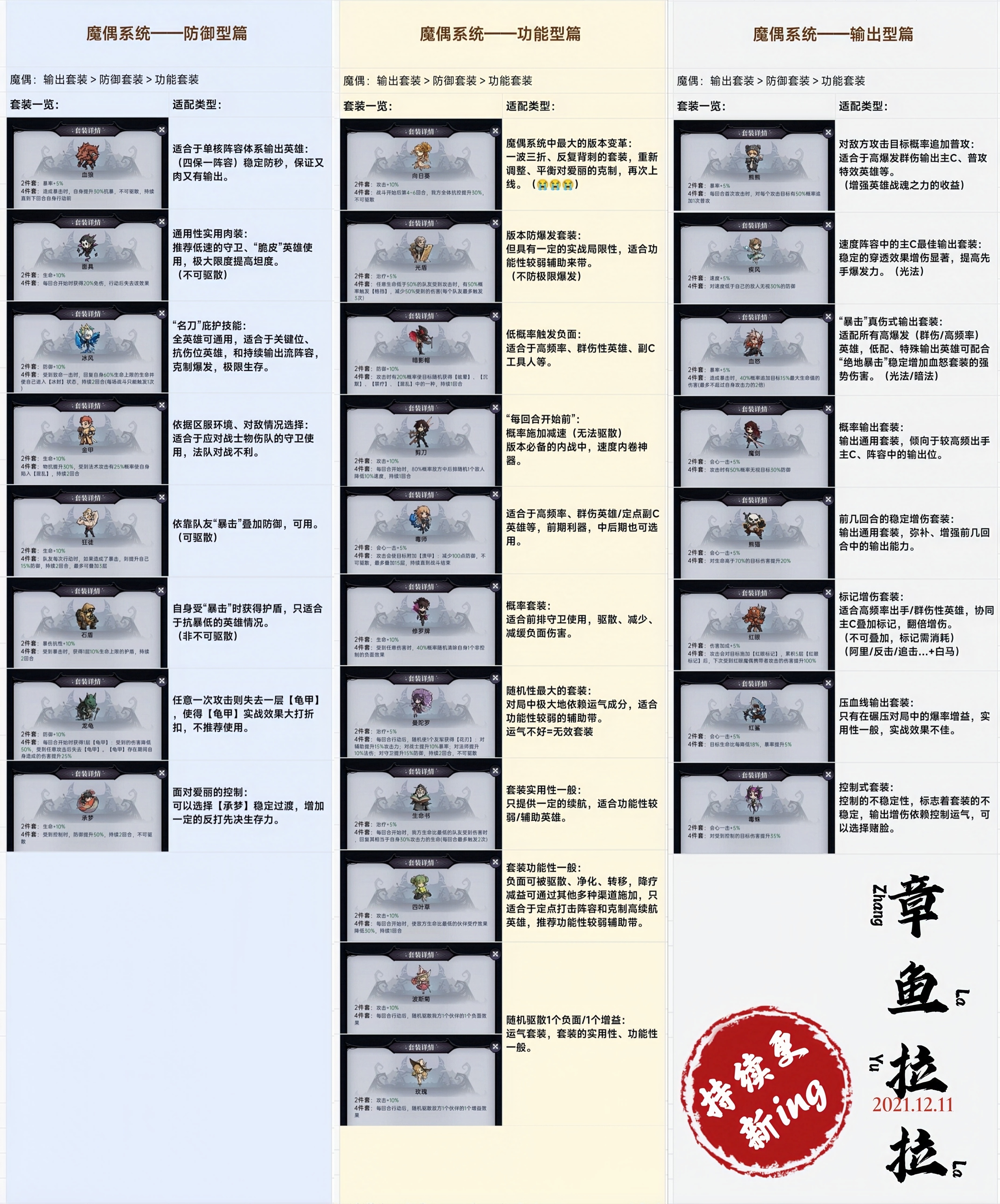 魔偶系统——套装篇章鱼拉拉发布于 2022-12-07关注在魔偶系统的上线以来,经过了一定的修改调整和实际测试,给大家整理一下: 每个人的英雄卡池、阵容搭配、对局环境的克制等实际情况均不相同;英雄、阵容、魔偶属性等关联的魔偶套装的选用也不唯一固定,只有选择适配的套装(魔偶属性)灵活克制搭配即可;同时,魔偶系统的选择随机性也给版本的对局情况增添了更多可玩性和可能性。(一定套装的适配性也需要后续的实测,之后也会同步修改更新哦~) 魔镜物语 全局加速卡牌放置自动点击器