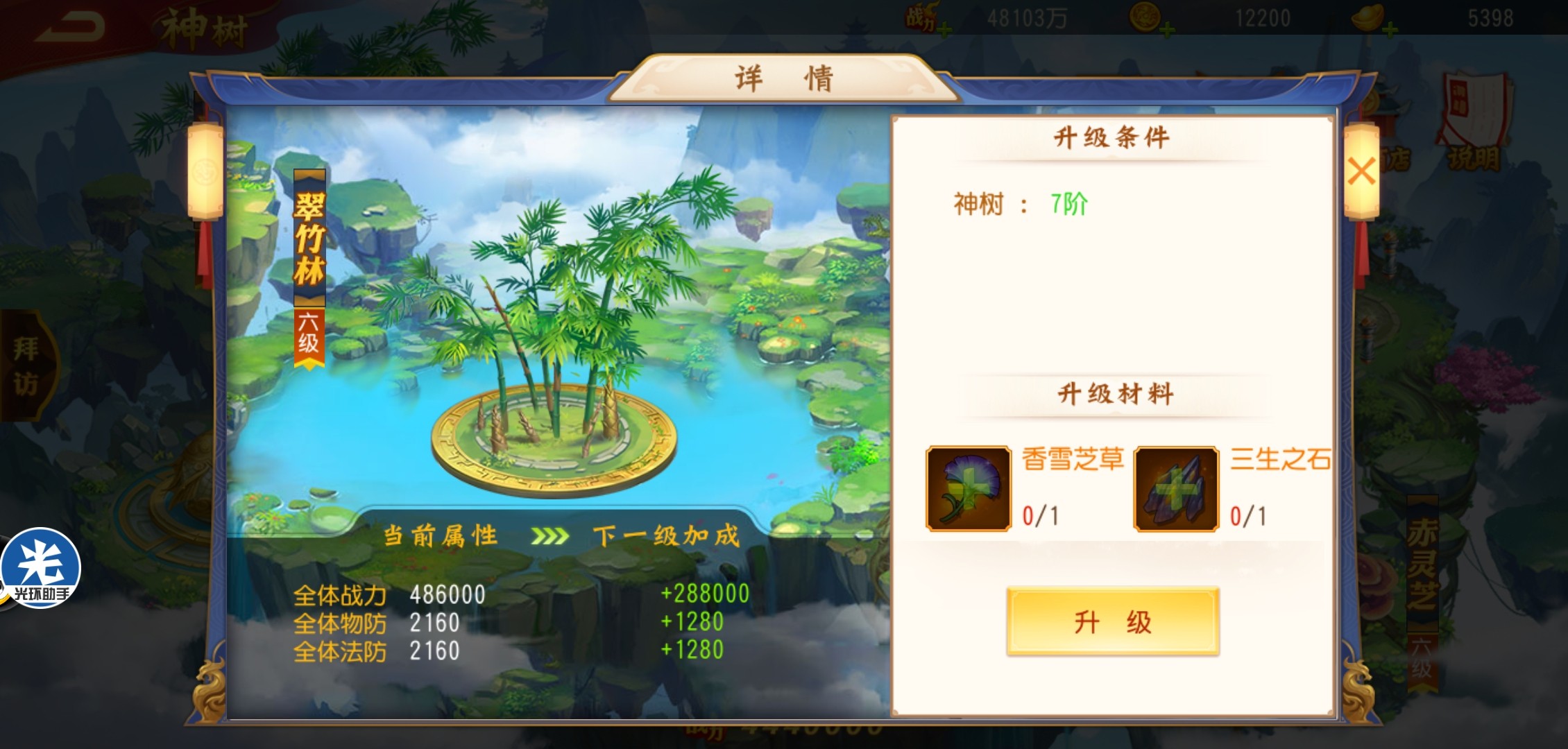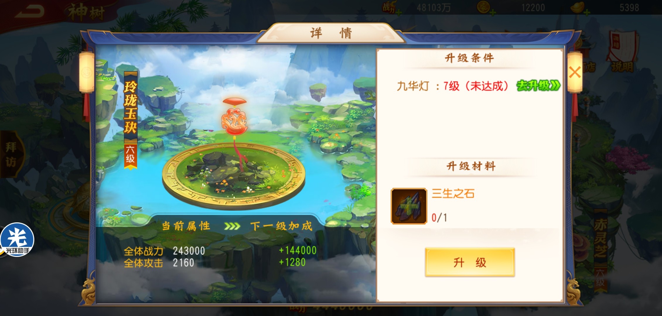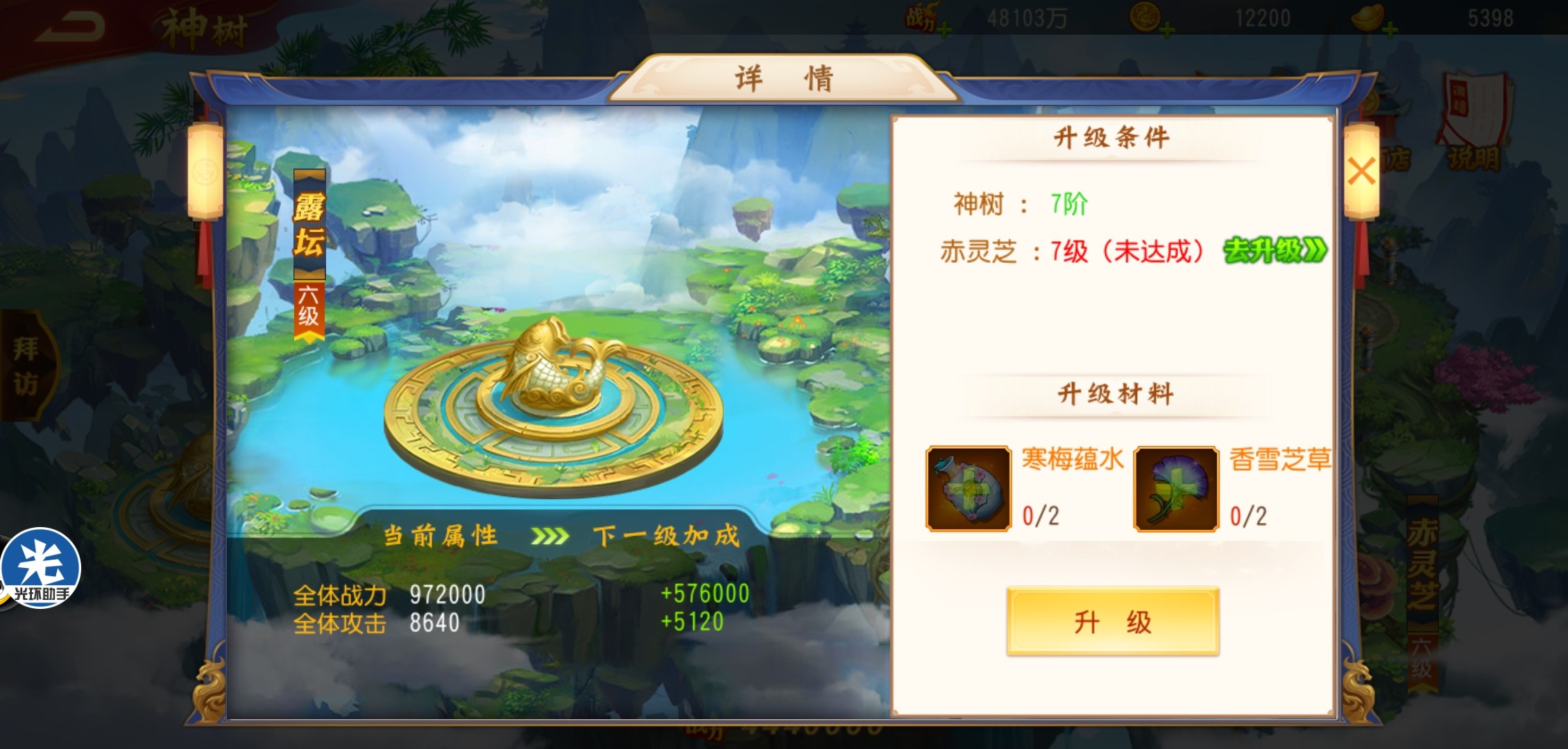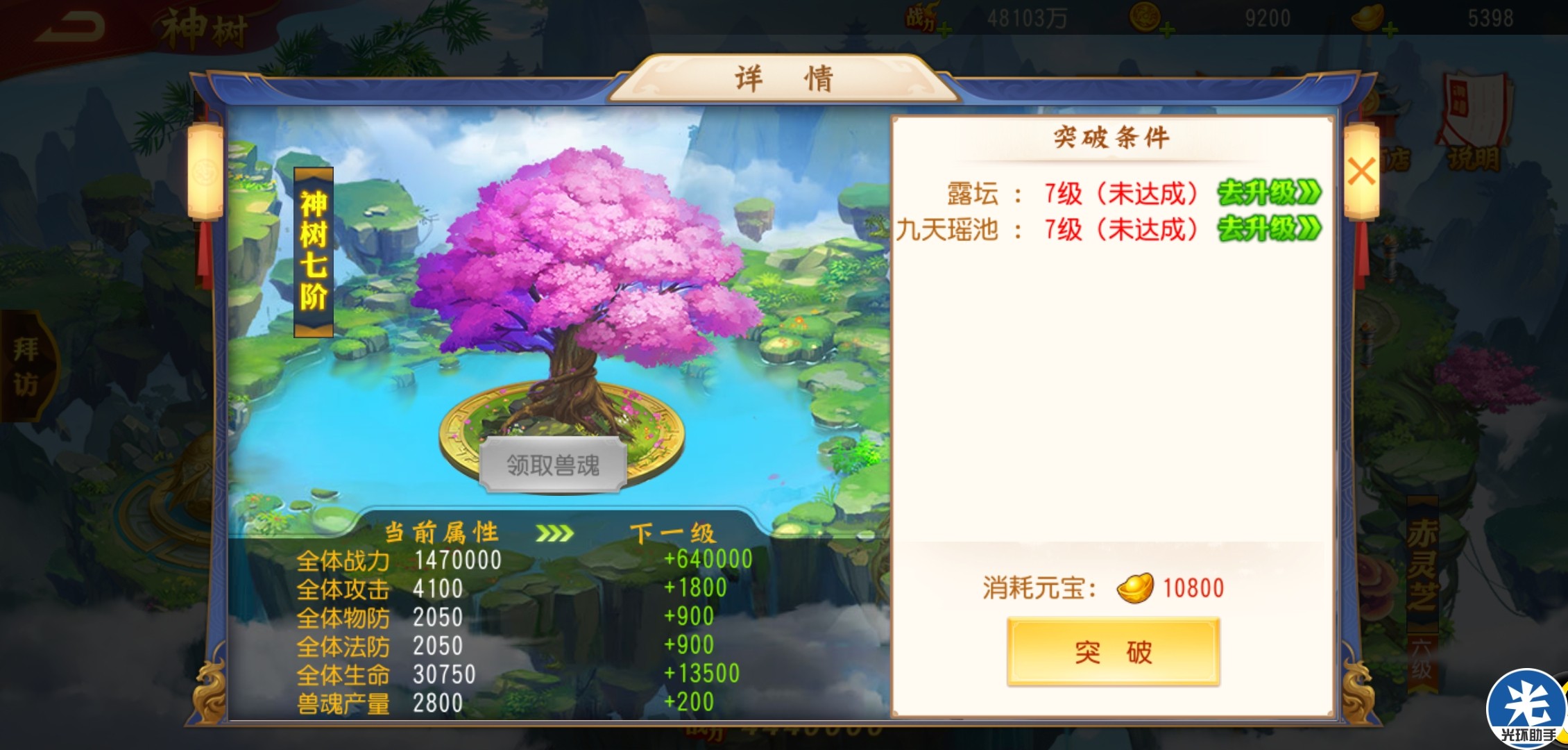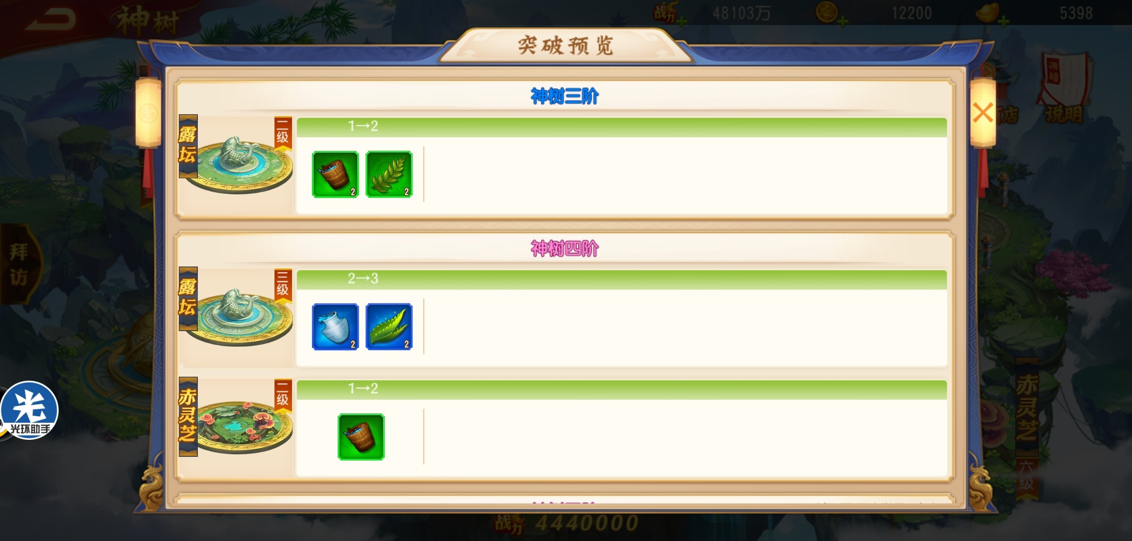 每一个饰品场景都有等级,只有等级达到才能进一步提升神树等级。神树等级突破需要大量元宝资源。
