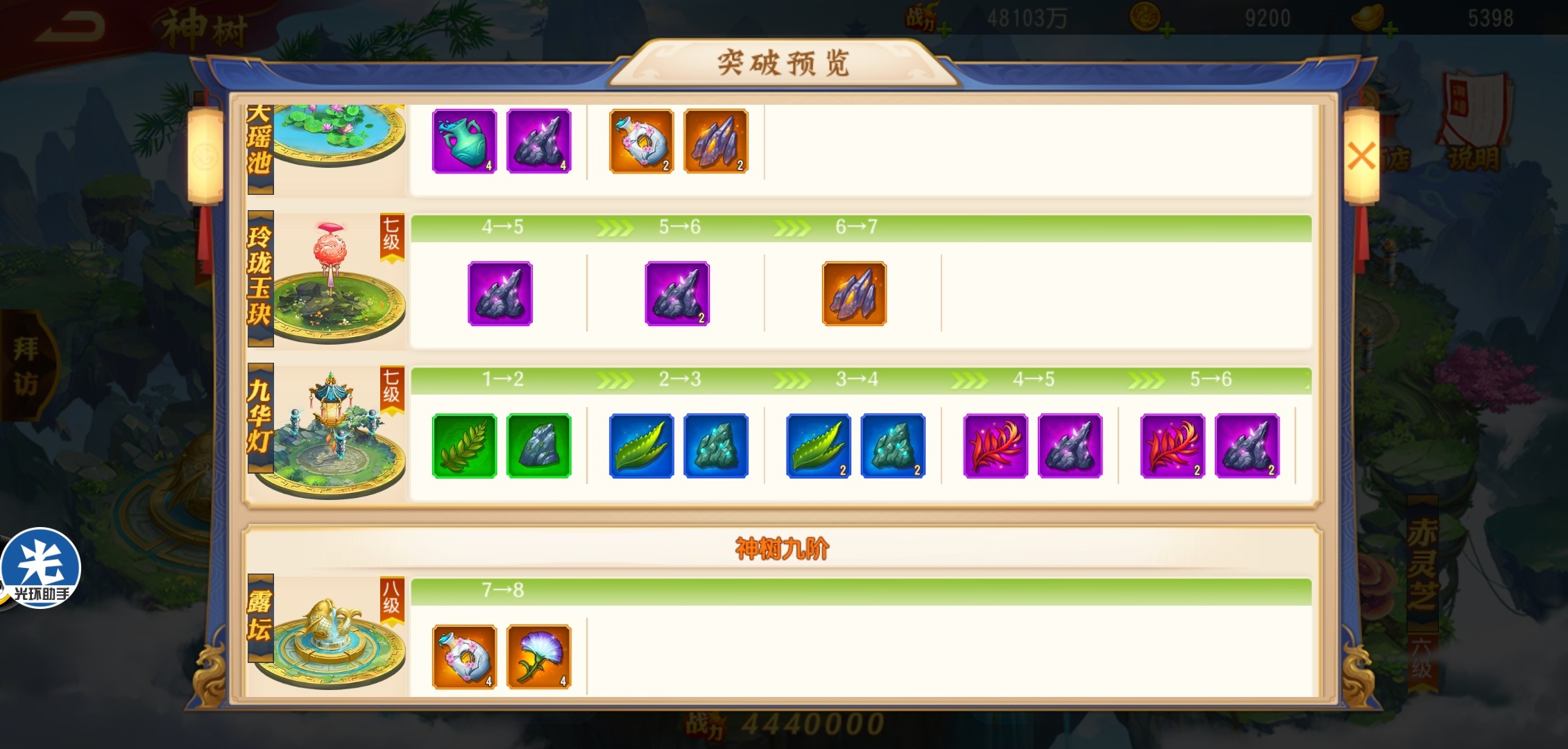 神树各场景的突破需要的材料种类和数量可以在突破预览里面查询。从一级到九级所需要的材料都有表明。