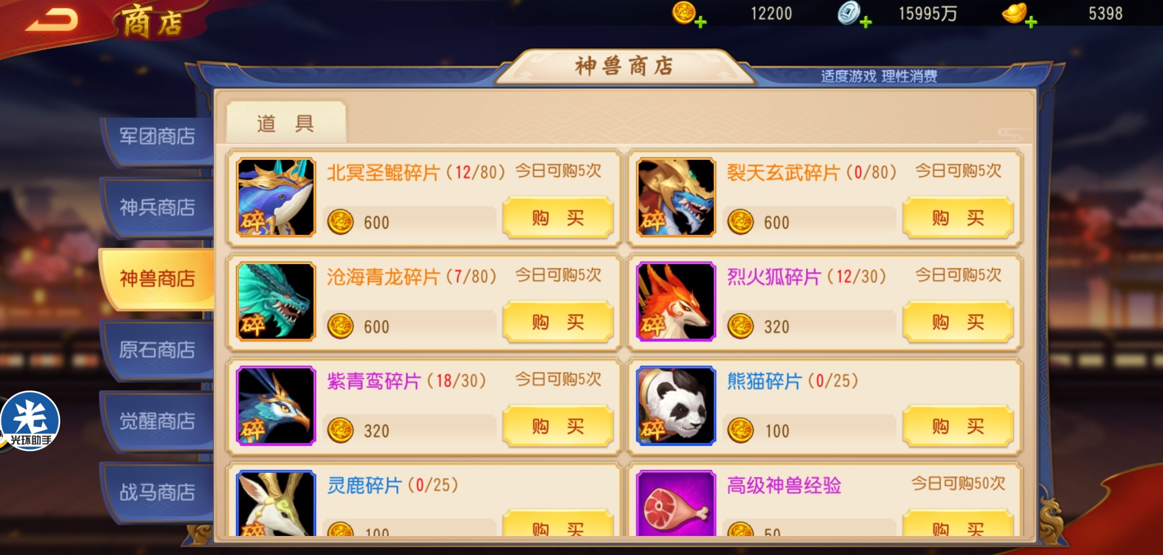 神树界面里可以直接跳转到神兽商店,里面的资源都需要使用兽魂购买。