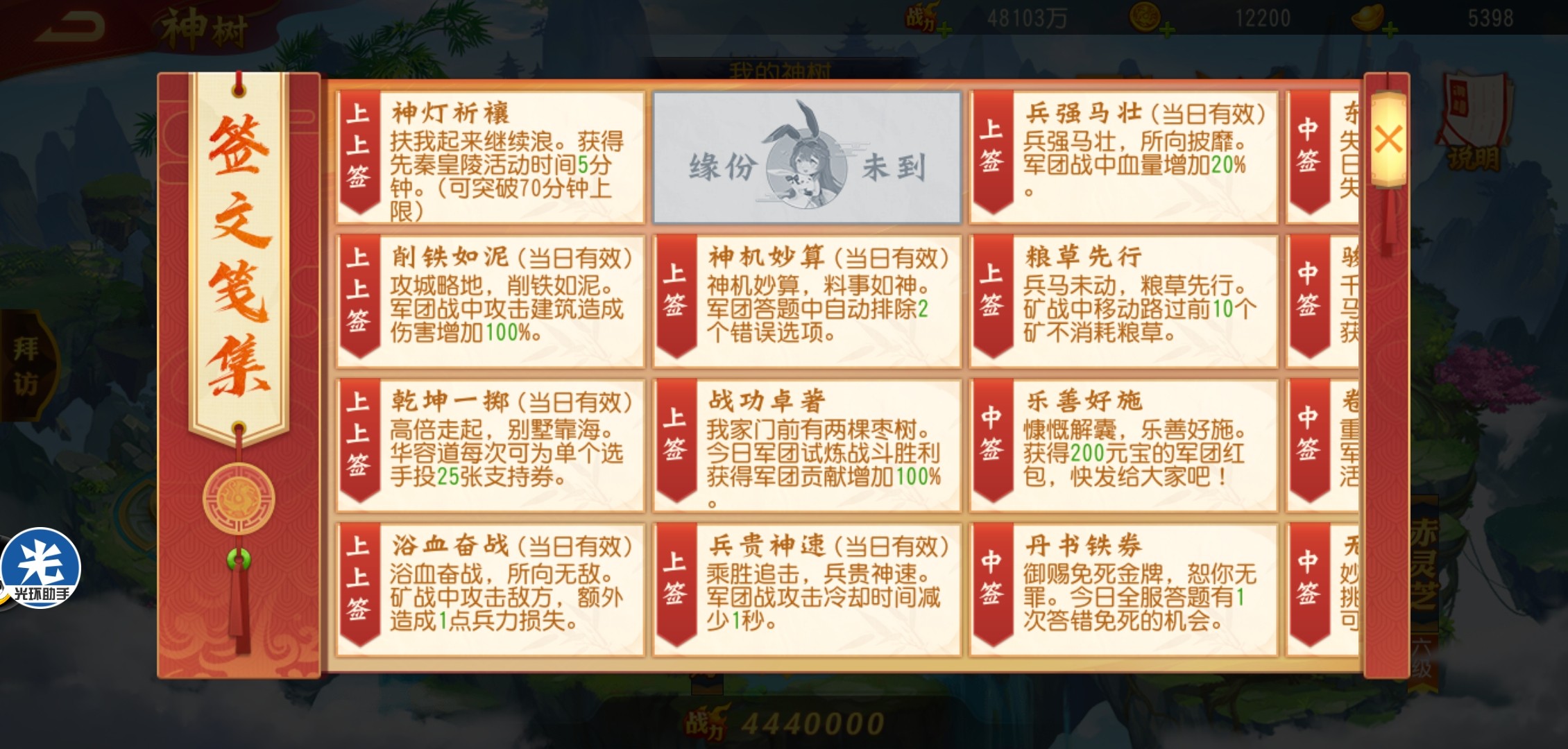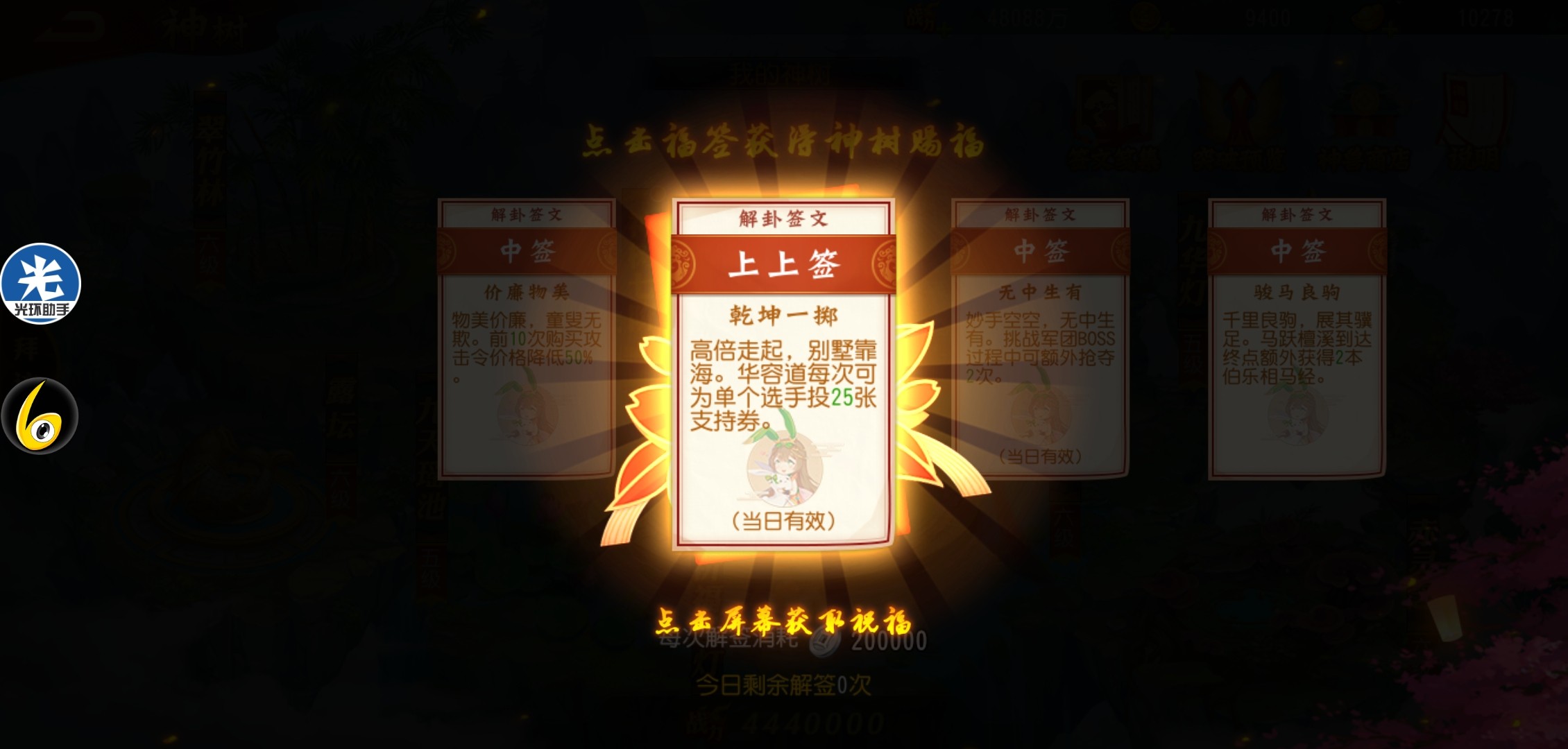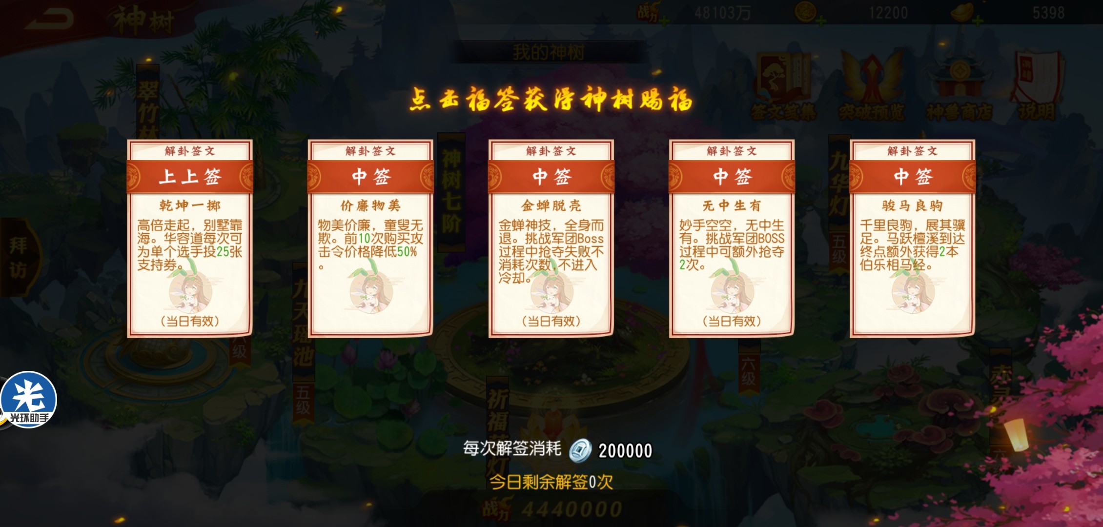 当神树到达5级,就可以开启祈福莲灯的祈福抽签功能。5级时可以抽三次签,神树到达7级可以抽5次签。