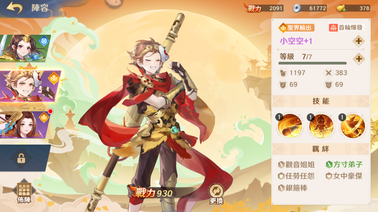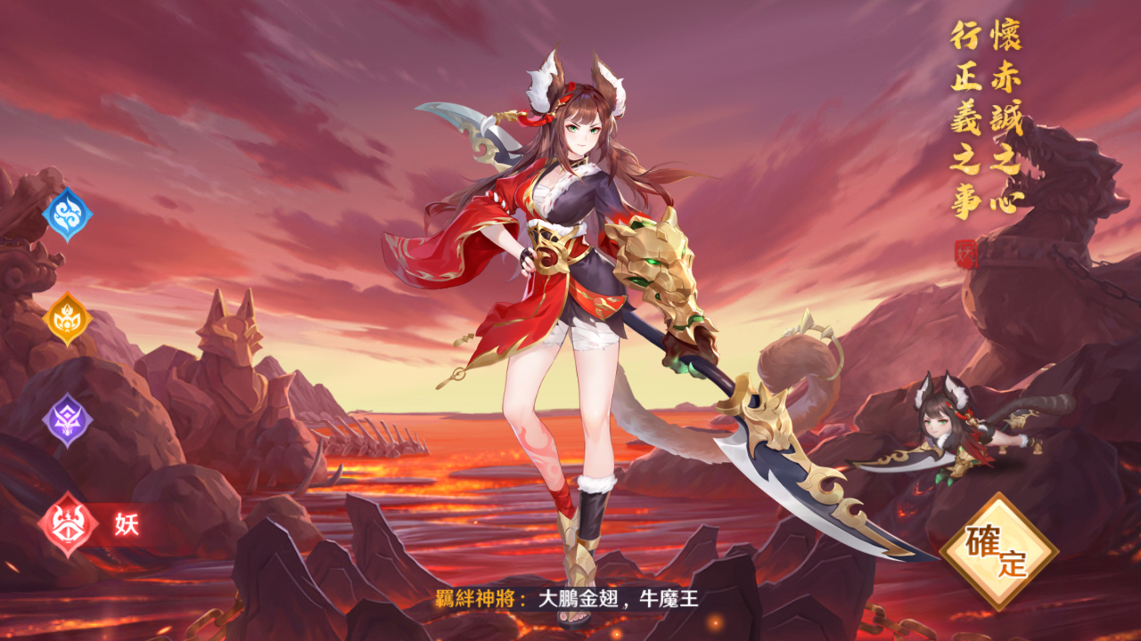 红色武将大鹏金翅、牛魔王都是主打后排输出,一个配合辅助橙将,一个配合治疗橙将。