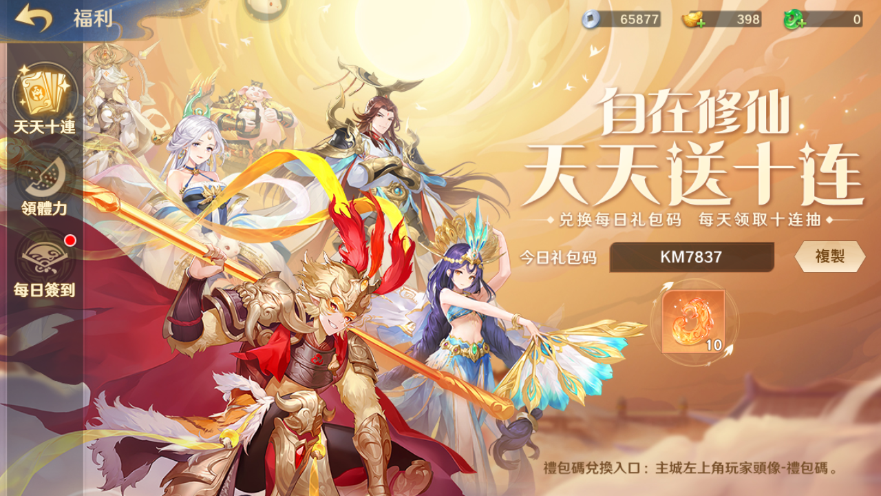 完成新手引导过后,就可以回到主界面,领取各种礼包奖励,同时还有礼包码VIP666 VIP888可以使用,还有天天送十连道具福利码,点头像就输入礼包码可得十连招募道具。