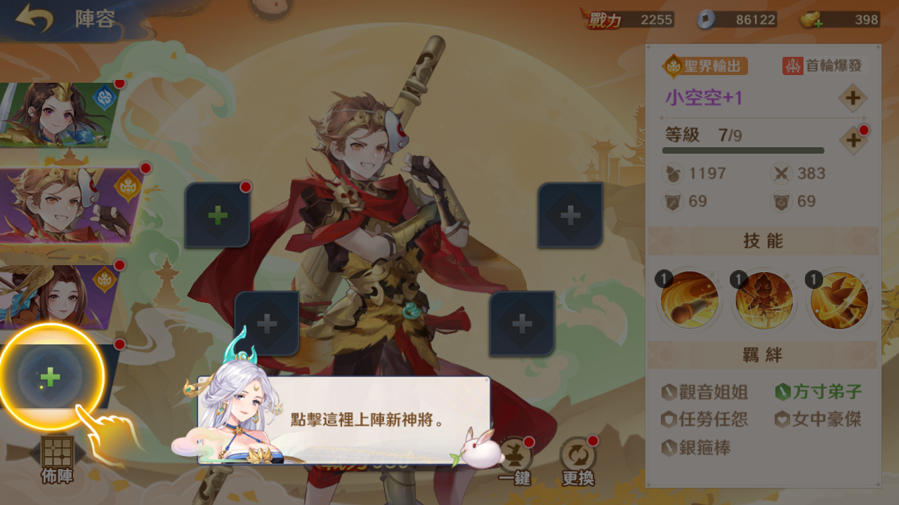 角色到达9级,系统就会强制推荐上阵第四个武将(加上主角),可以大胆上四将开局,因为在布阵时是可以拖拽上阵武将下阵的,能够自由控制上阵武将人数。