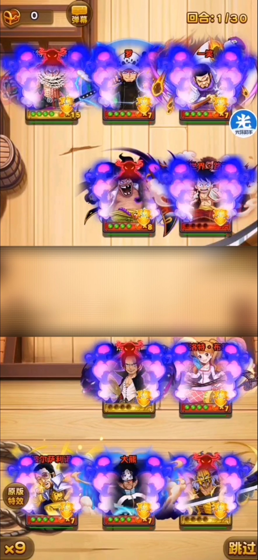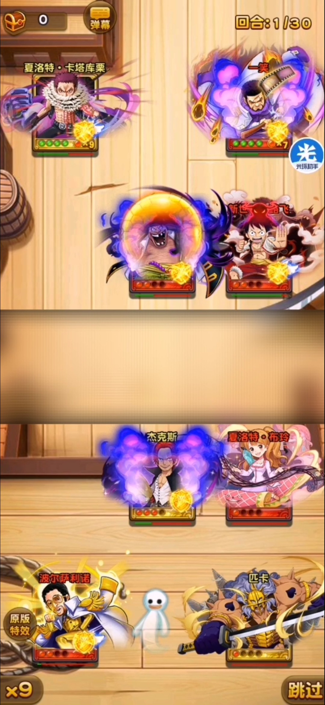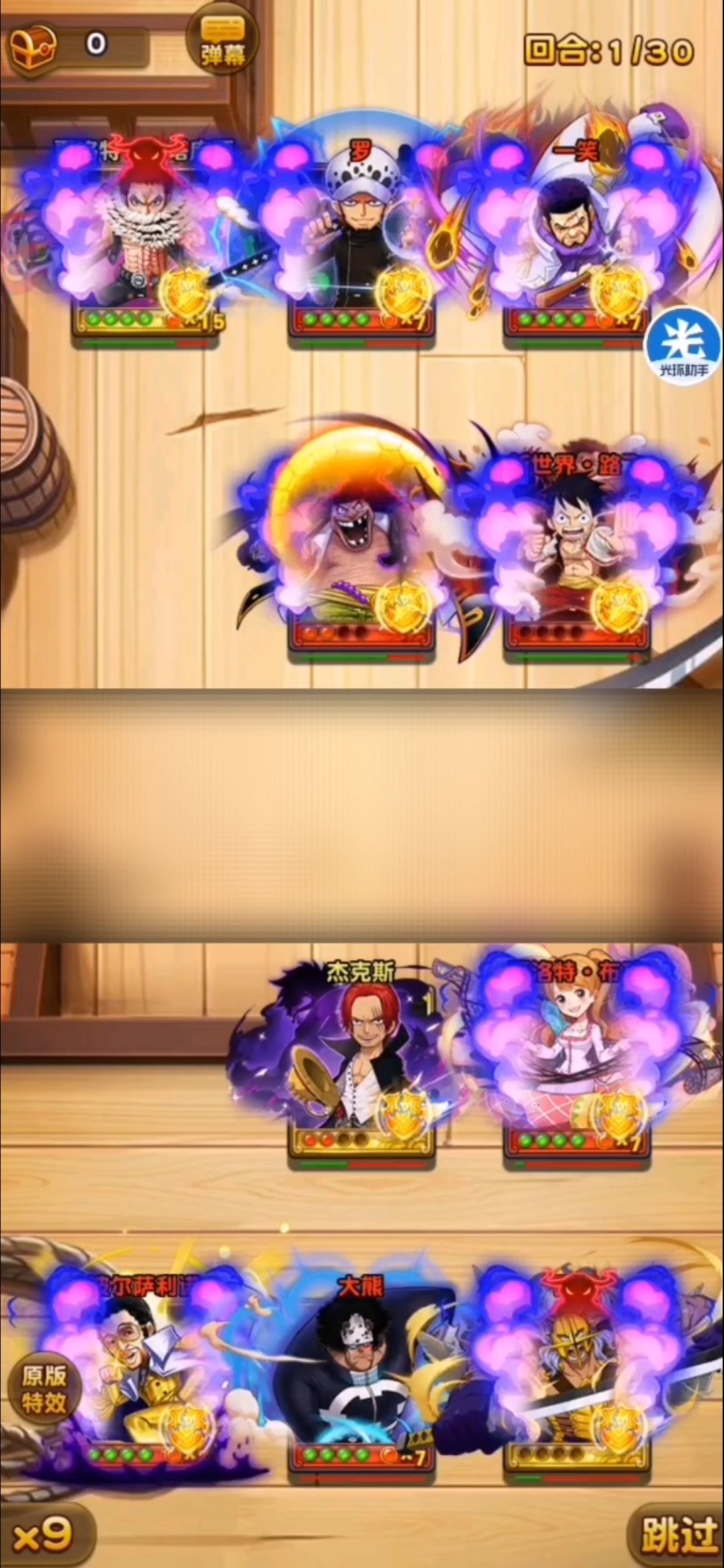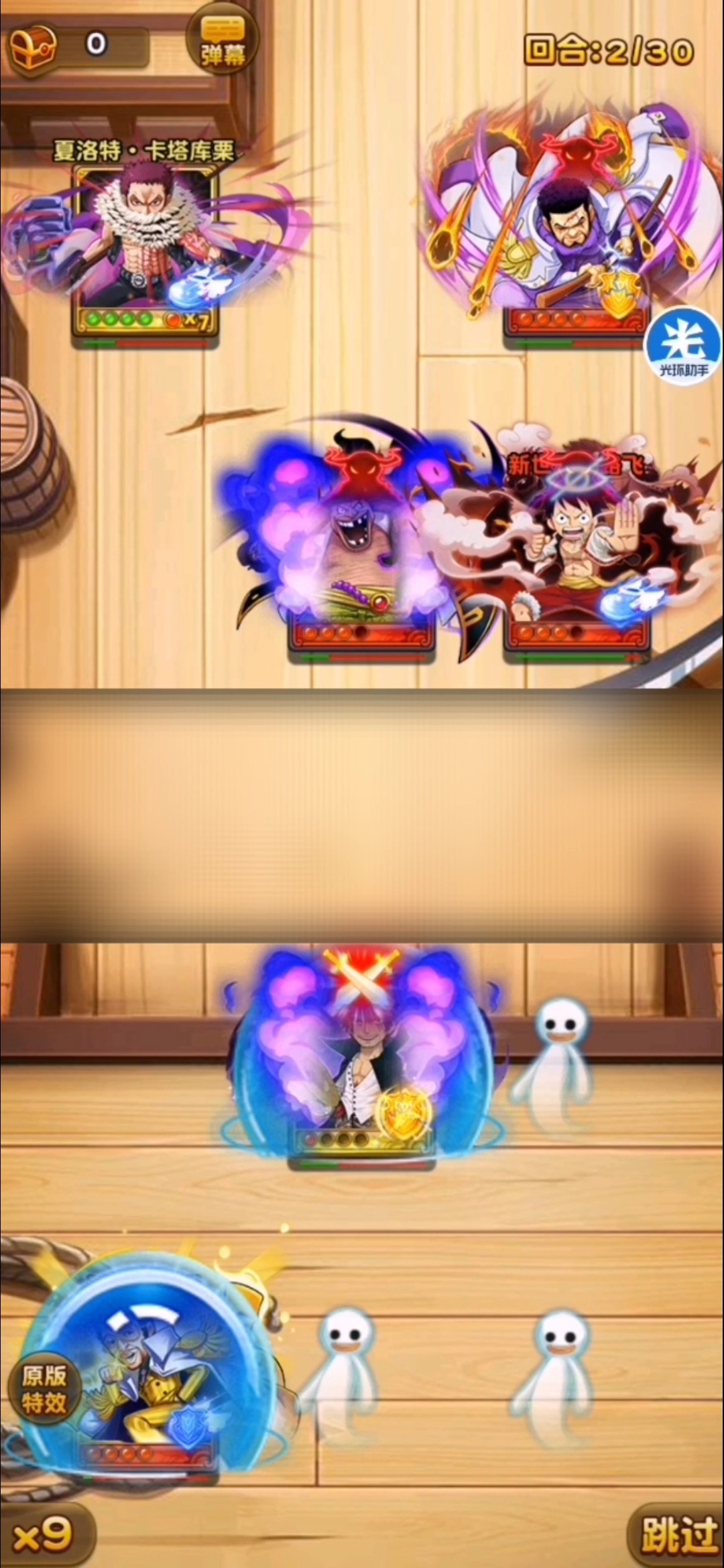 到第二回合的时候我方红发出手差点把敌方卡二带走并且附上的控制效果与减怒可惜打的不是黑胡子也没有把他控住,