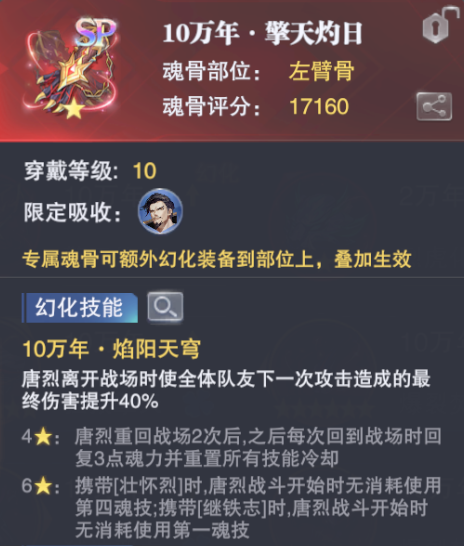 结合则是唐烈在PVP中的实测情况,因为测试服的真人PK战斗并不是那么好找,所以目前大致的测试结果是唐烈的PVP强度还是不错的,特别是在破盾输出方面会拥有非常有价值的体现,具体魂环配置可以考虑2122,加点攻击or暴伤,其输出逻辑主要是靠开局6星魂骨的4技能自动释放先来一波输出(当然如果你觉得自动释放1技能就能把对方给干趴下了,考虑22XX的魂环配置也可以),然后轮到唐烈行动时其使用1-2技能【凛威锤】再打一波强势输出,接着凭借2-1被动的离场特效短暂自保,1回合后回到战场还能对全体敌人造成极为可观的破盾+群体输出,这三波输出过后......基本上对面也就遍地残血了。