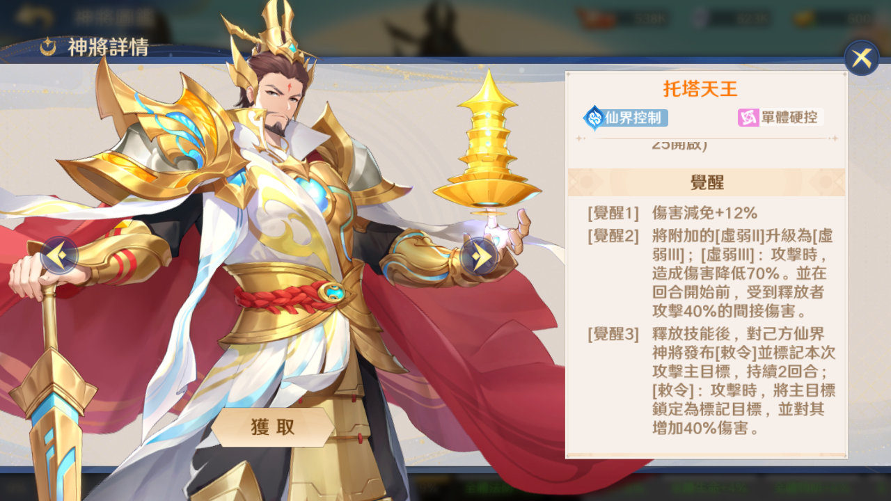 托塔天王算是仙界统帅级的人物,能够令对手虚弱,伤害能力下降,并且还能为敌方目标标记敕令,让我方仙界武将精准打击,一定程度上改变了仙界大多数武将只能攻击前排的弊端。