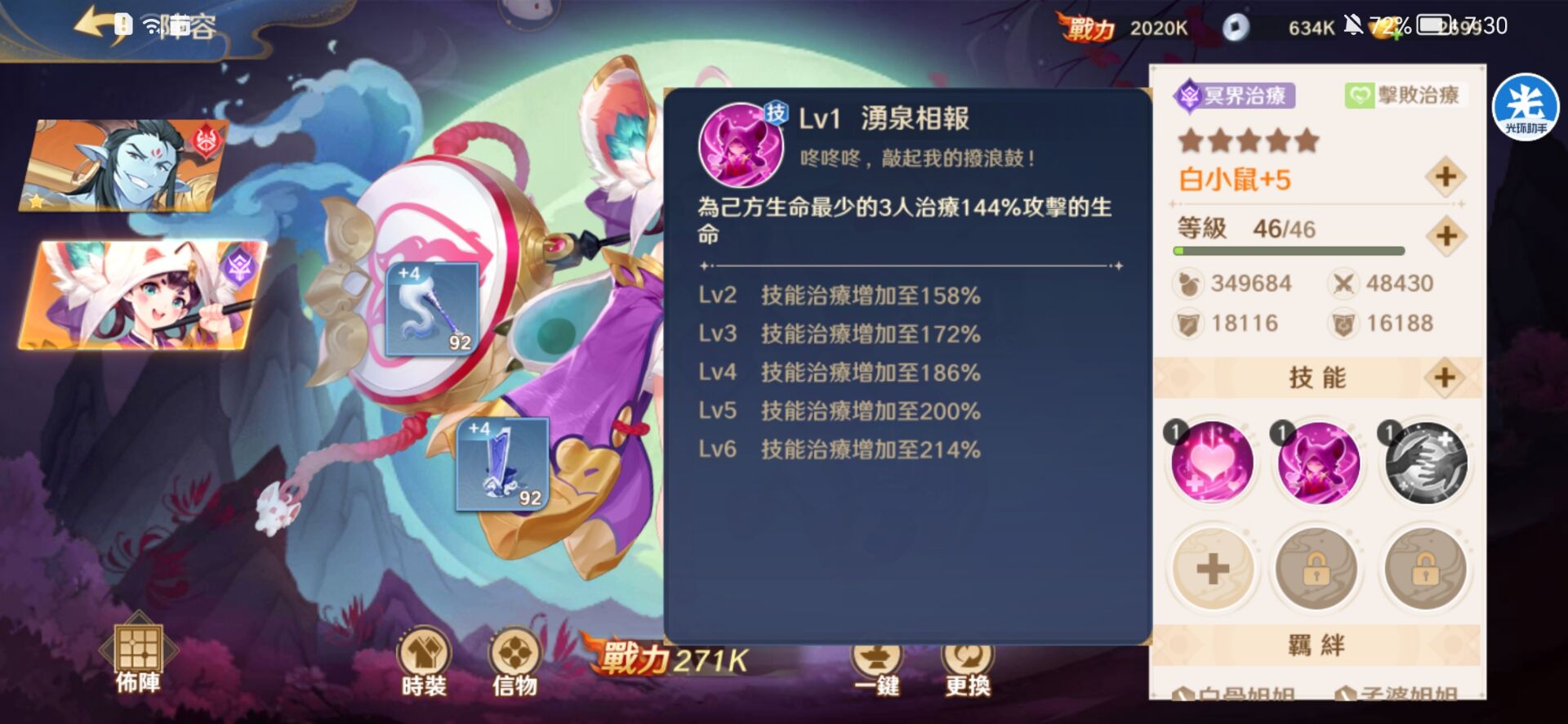 白小鼠,身为我们冥界为数不多的回血奶妈之一,有着十分不错的治疗量,可以为我们的角色提供续航能力,并且还可以与红将白骨夫人一起上阵激活羁绊。