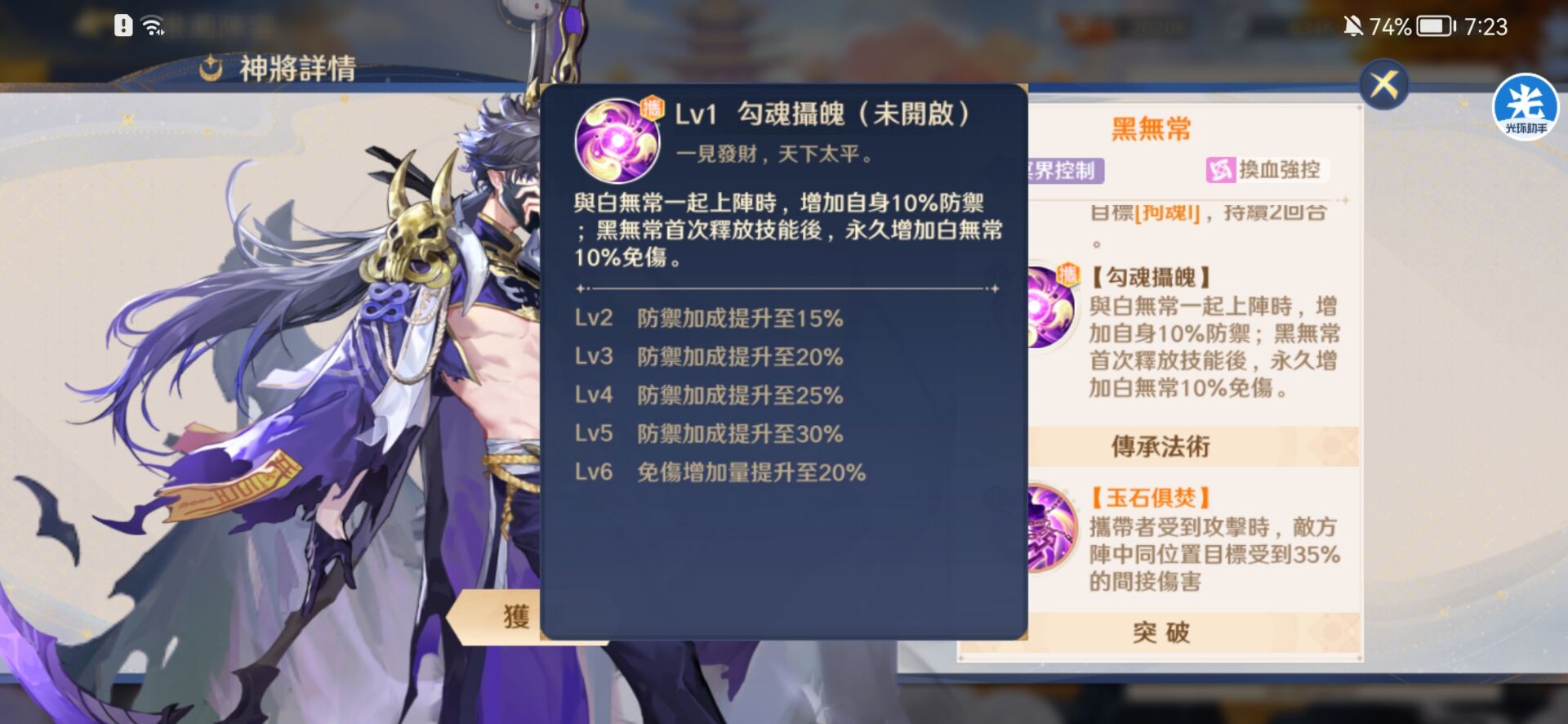黑无常高冷大帅哥,与白无常一起上阵时增加10%的防御力,首回合释放技能后给白无常增加10%的免伤。自身技能可以对敌方单体造成百分比高额物伤,并降低对方怒气值,持续两回合。