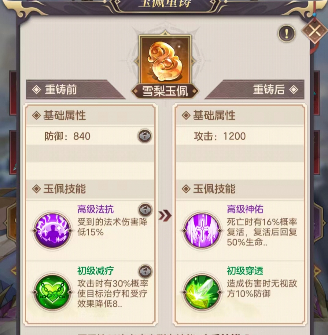 1.玉佩、锦囊技能冲突,同种技能只生效等级较高的一个;