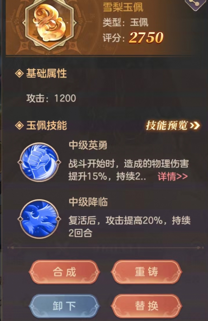 评价:特定人员佩戴极大提升伤害,适合暴击率较高人群,如孙策、孙策、孙权、吕玲绮、关羽,以及可佩戴无尽的香香、袁绍等。