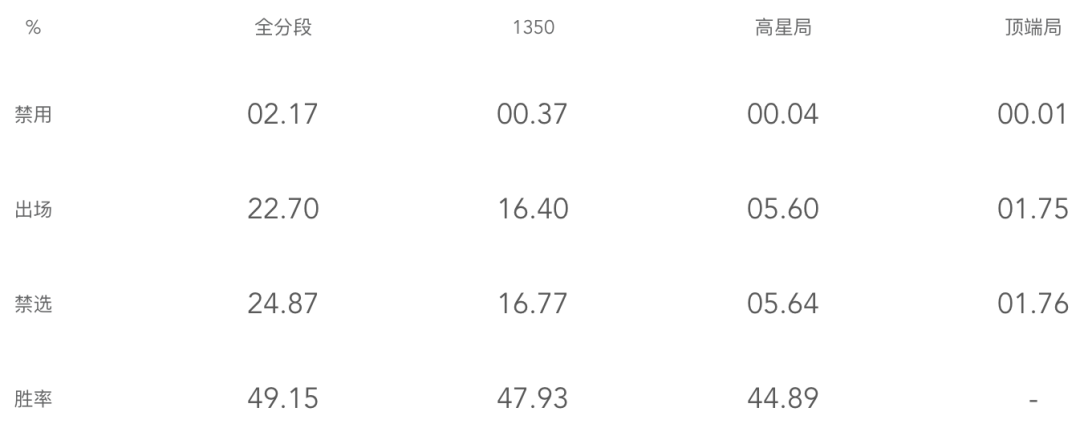 其实从上述正式服的数据来看,猴子的整体数据不是很好看的,在全分段位猴子的胜率是49.15%,出场率是22.70%,胜率可是说非常的低甚至比典韦都低,到了巅峰赛1350+猴子到胜率是47.93%,出场率是16.40%,最后高星局胜率更是来到了44.89%,出场率是05.60%,在三者上猴子都是非常低,问题就是出在其上限虽然是有,但是下限也非常的低,因为猴子在大家同等经济情况的时候操作还是有条件的,操作起来难度还是有,打不出暴击的时候经常有。