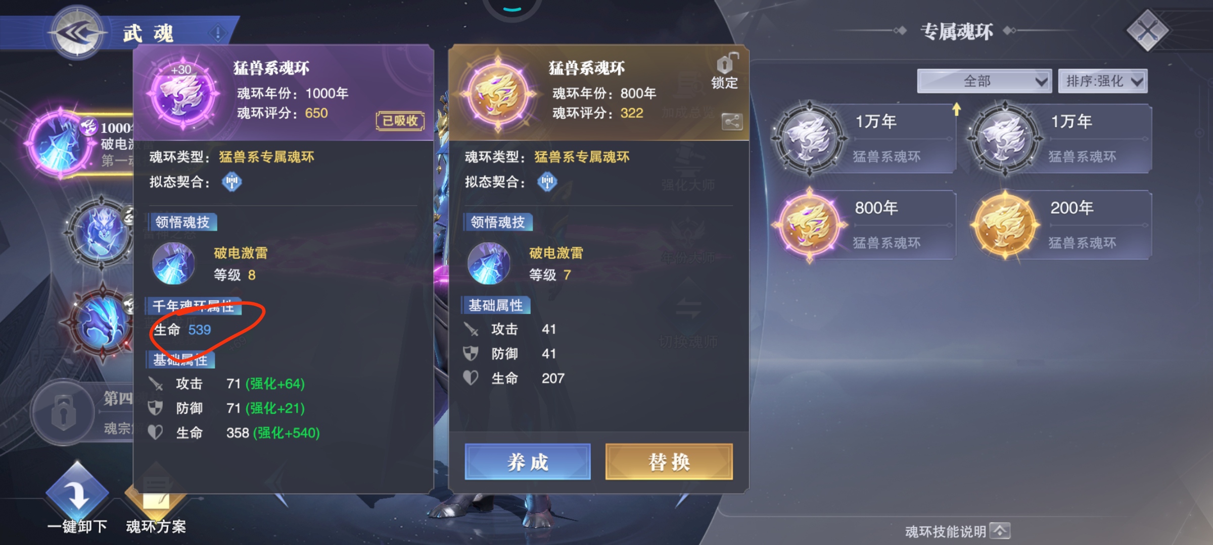 差别在哪,千年魂环开始就有额外属性了,有点魂环还没有,有额外属性的就属于比较珍稀的魂环,,每个魂环提供的额外属性不一样,当然年限越久属性越强,接下来大家看基本属性,明显可以看出来千年是比百年强的,所以我们选魂环优选考虑年限高的,比如说这个千年魂环,增加了额外属性为生命力提升了539,如果你养成魂环的话,它的额外属性还会增加的!