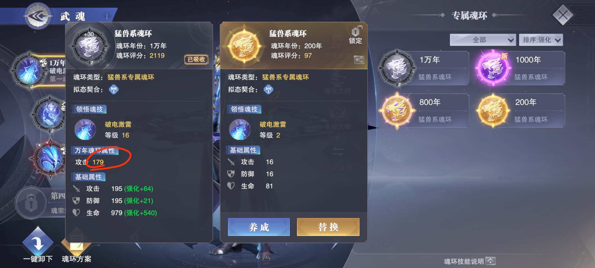 我们来看对比,万年和百年魂环,有好大的差别,攻击力,防御力,生命力,都有好大的提升吧,千年和万年魂环,就不用对比了吧,年限是魂环重重之重🙃