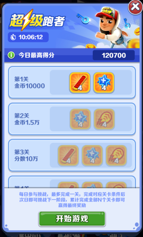 活动内容:12月15日起,跑酷者们可随机获得角色或滑板,每日参与无尽模式分数挑战,达成当日挑战目标,即可解锁一定奖励并通往下一关,通关完毕即可赢得最终奖励。