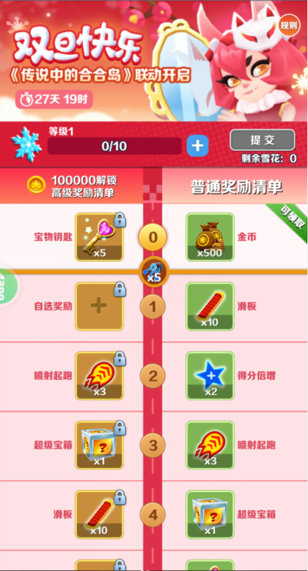 活动内容:节日限定活动上线,在高级奖励清单藏着《传说中的合合岛》联动角色「妲己」,通过无尽模式赛道或指定任务收集「雪花」即可解锁。