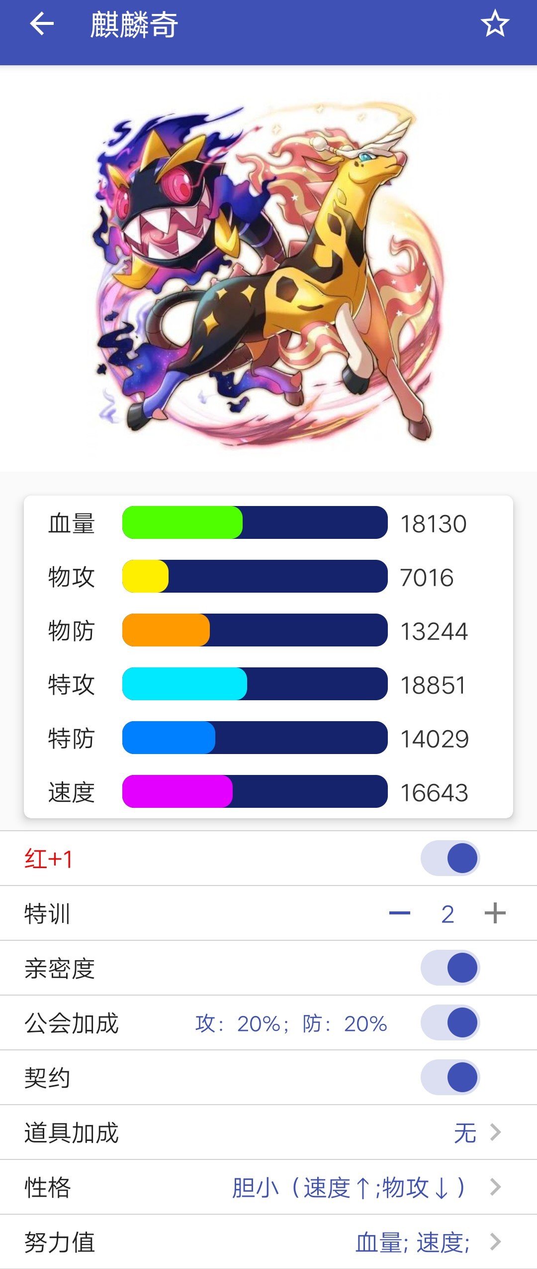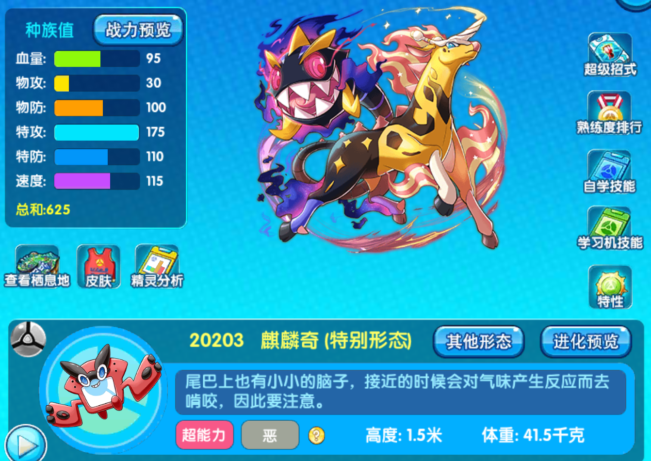 分析:175特攻板面的麒麟奇加了50%特攻后,非常的强大。比别人那种大力士的还要威力大。带恶波动,我们都知道它是有几率退骚的,所以选择胆小。不加血量脆皮了点,特攻诡计一发就会变得无比的强大。打击面除了恶系0.5倍以外,没有之一。