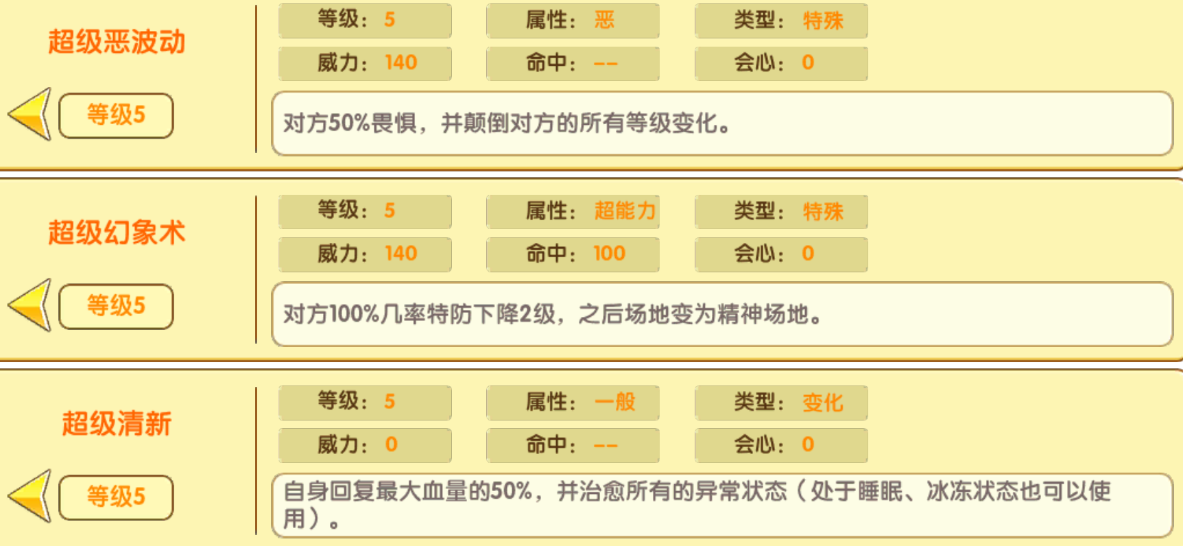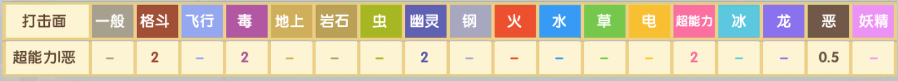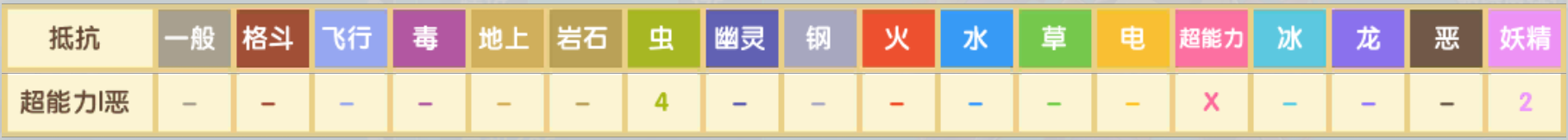 从种族值来看特攻突出,物防100,特防110,速度115,血量95。可用种族值为595。超能力和恶系的它抗性比较好,虽然说没有抵抗,但也没有太多弱点,这就造就了它可以用来抗。没错,用来抗。⌯'ㅅ'⌯