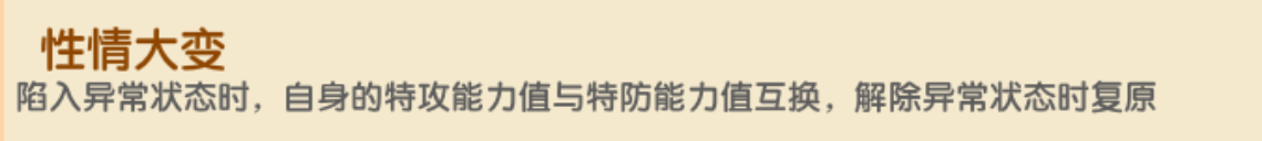 (带火焰珠,让自己陷入灼烧,反正不带物理系技能,减半伤害也影响不到麒麟奇,而且使用诡计的话还会提升特防,因为特性互换,这样只会使它越来越肉,而接棒的话是自学的,作为一只可以拥有好的抗性和不俗的特防能力的宠,能学接棒,是可以果断选择玩接棒的,缺点:面对物攻宠时比较乏力,专门挑那种辅助宠时上场)