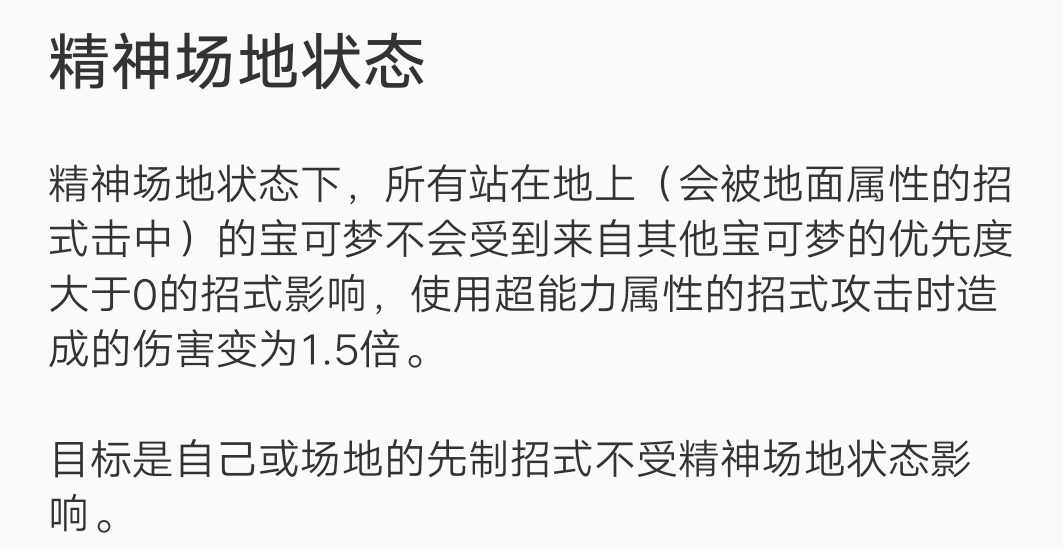 所有站在地上的宝可梦(飞行系如果处于击落,重力状态也算。尾刃风暴,千剑齐发,未使用前不计入影响)不会受到来自于其他宝可梦优先度>0的招式影响。(也就是说非站在地上的宝可梦,精神场地下优先度技能影响,也就是说没有优先度,正常速度多少就按多少计算),使用超能力技能威力提升1.5倍。目标是自己或者场地的先制招式不受精神场地状态影响。看你玩哪套玩法。两种玩法供你选择。