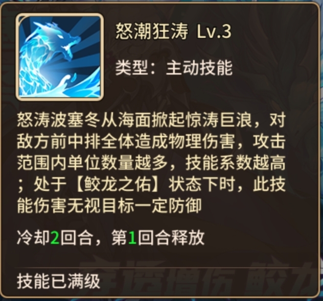 怒涛波塞冬从海面掀起惊涛巨浪,对敌方前中排全体造成物理伤害,攻击范围内单位数量越多,技能系数越高;处于[鲛龙之佑] 状态下时,此技能伤害无视目标一定防御