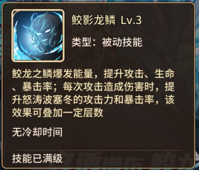 鲛龙之鳞爆发能量,提升攻击、生命、暴击率;每次攻击造成伤害时,提升怒涛波塞冬的攻击力和暴击率,该效果可叠加一定层数