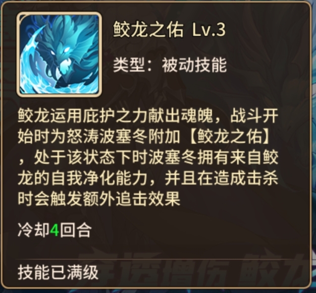 解析:这个技能是开局就会给波塞冬附加的效果,根据名字来看是一个偏防御性的buff,具备自我净化能力可能是行动的时候会清除自己身上的debuff,然后有一定的免伤加成。造成击杀以后的追击效果应该是普攻一次。