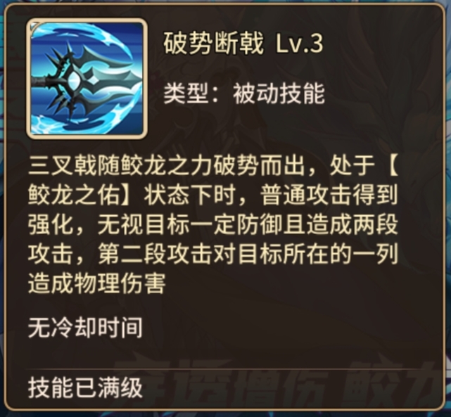 三叉戟随皎龙之力破势而出,处于[鲛龙之佑]状态下时,普通攻击得到强化,无视目标一定防御且造成两段攻击,第二段攻击对目标所在的一列造成物理伤害。