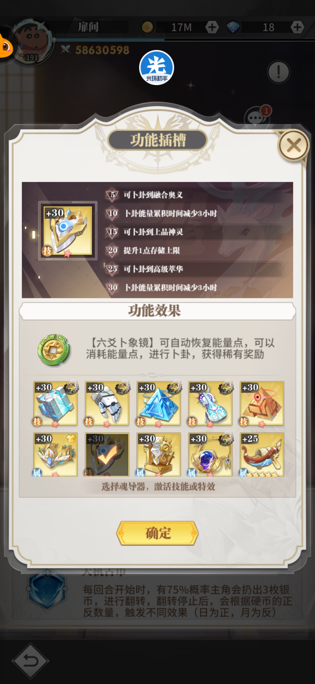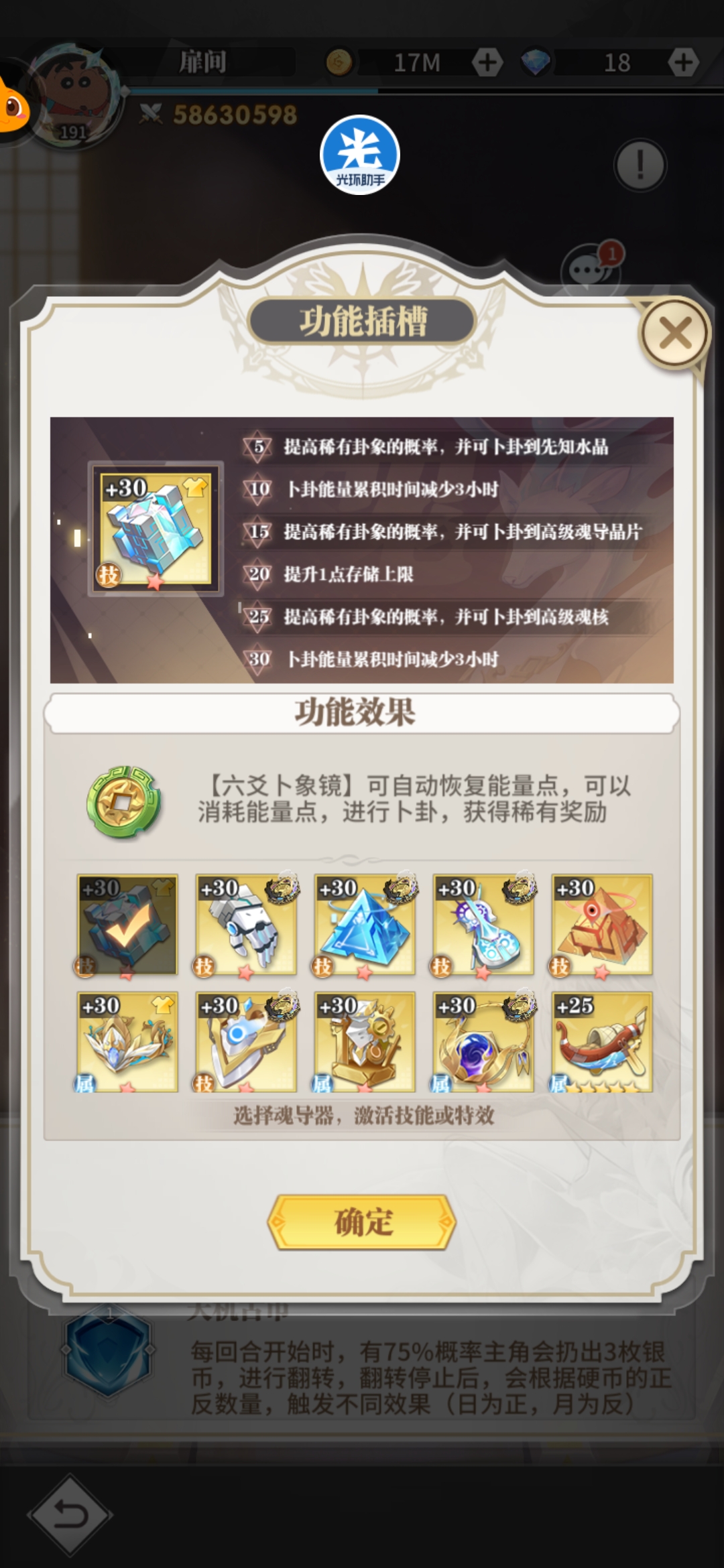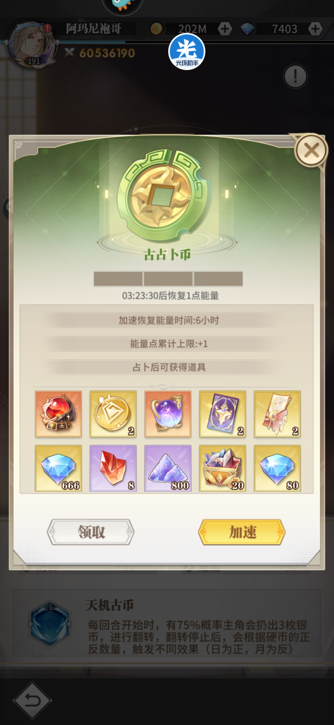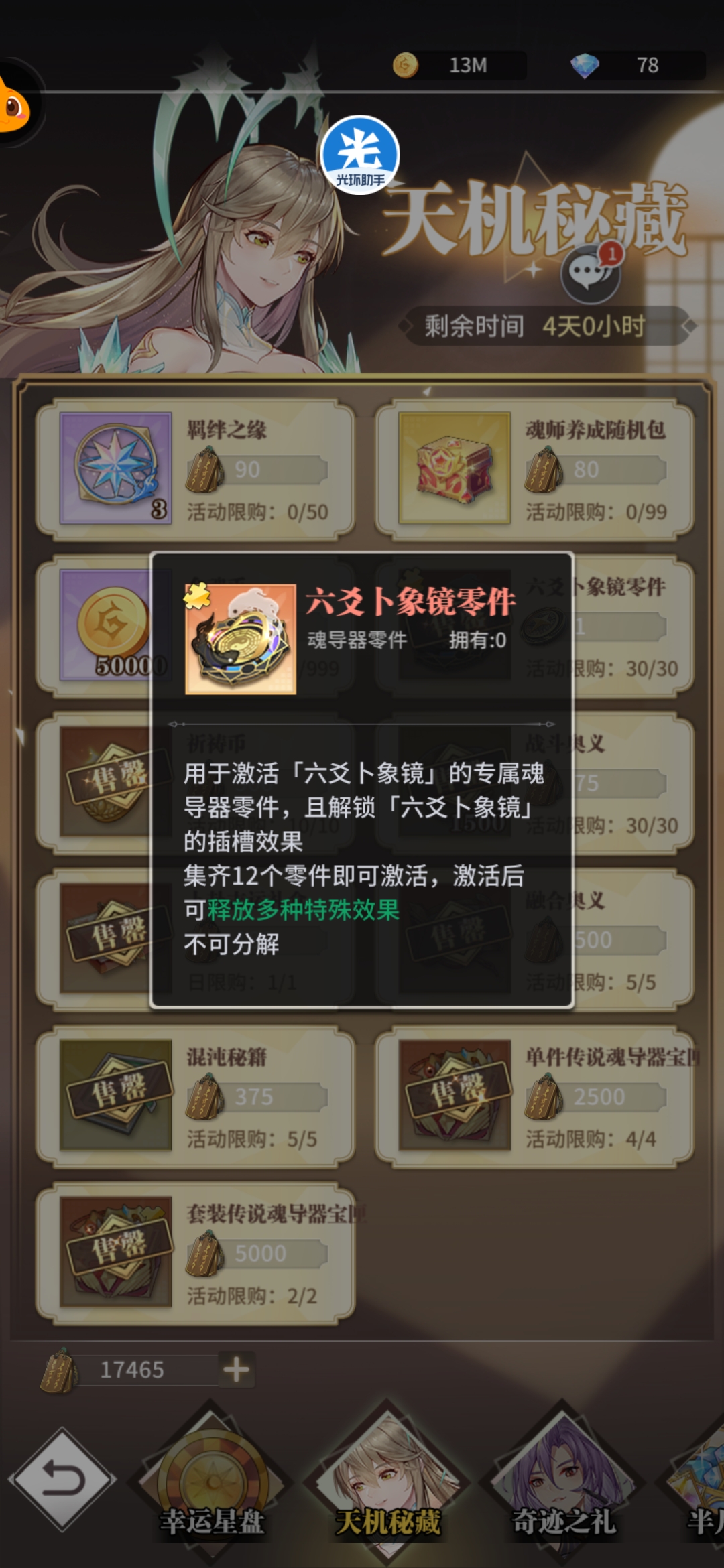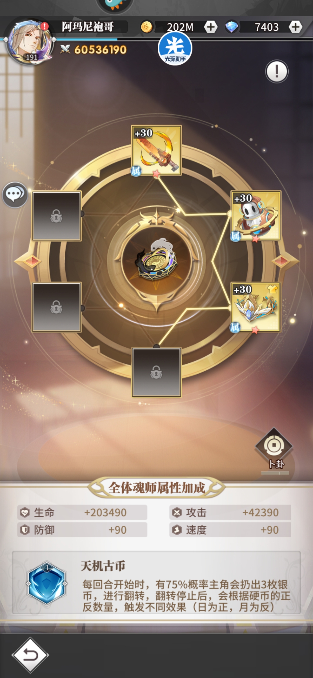 首先该魂导器需要12个诸方索隐兑换12个零件激活,激活后自带三个孔,大概加90万战力,同是每日可以占卦一次,并可以用聚魂核心或者橙色魂导器碎片加速。
