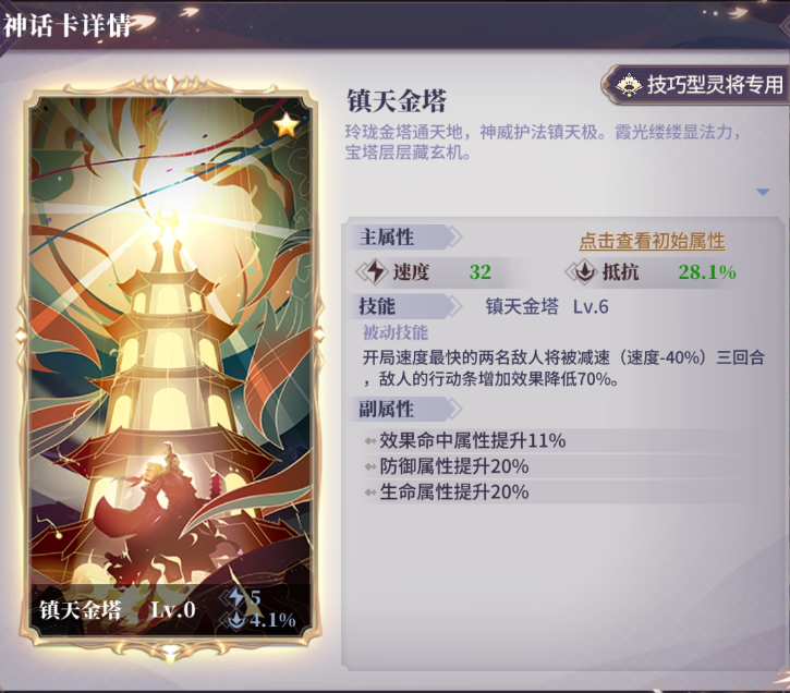 镇天金塔:人手一张的神话卡,全阵容必备,如果没有这张神话卡,你拼速度直接拼不过其他人,会被对面先手控制加秒杀一套带走。直接削减敌方速度的战略意义不言而喻,而且降低敌方行动条的获取效果也是极为强大的被动,能延缓敌方释放技能。
