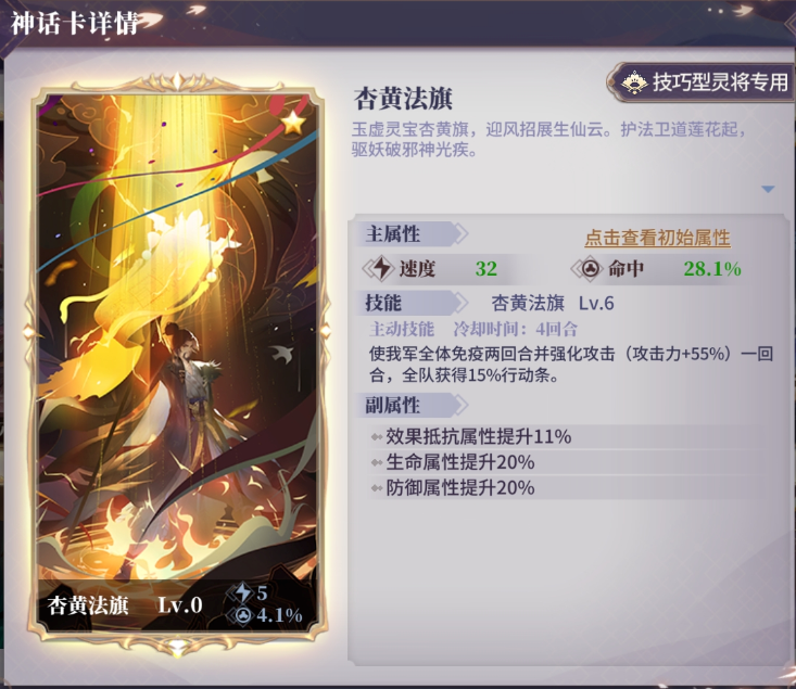 杏黄法旗:一波流必备神话卡,群体免疫还附加强化攻击效果,全体加行动条的特性能直接第一回合就释放技能,属于极为强势的进攻型神话卡,主属性加速度的特性也让其保证了自身的速度。