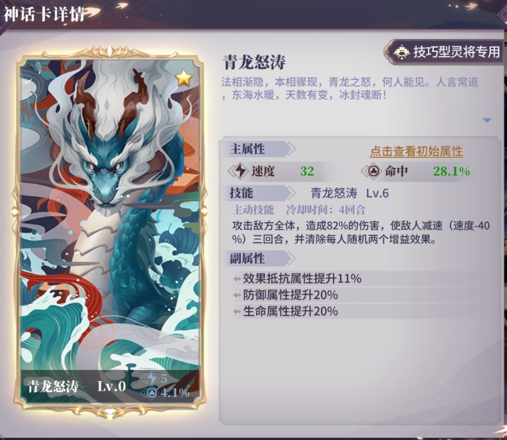 青龙怒涛:清除增益,群体减速,但是相比于镇天金塔,青龙怒涛的减速需要释放神话卡技能才能实现,镇天金塔直接是被动开局减速,稍逊色一筹,但是搭配镇天金塔一起使用,全程减速也是很强势的组合。