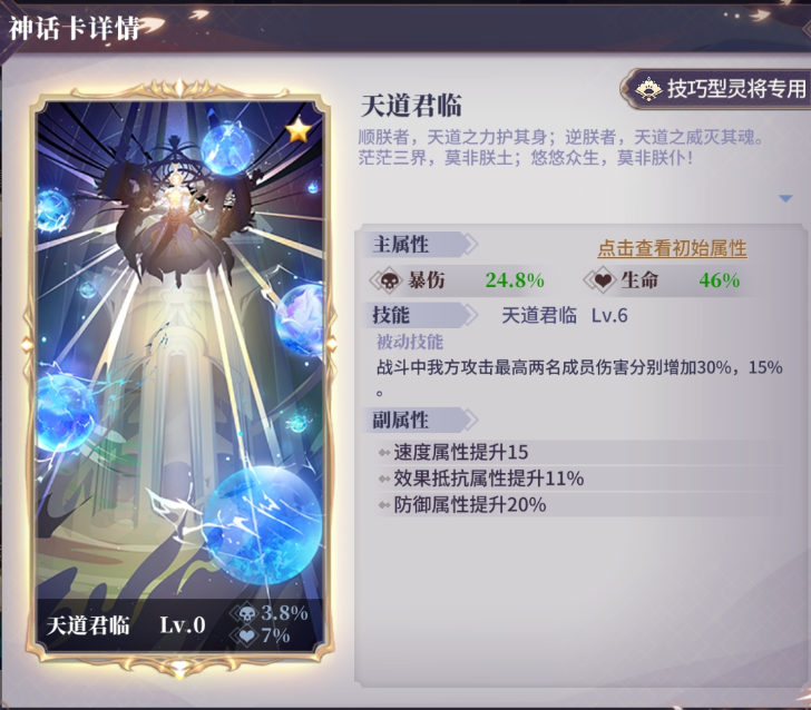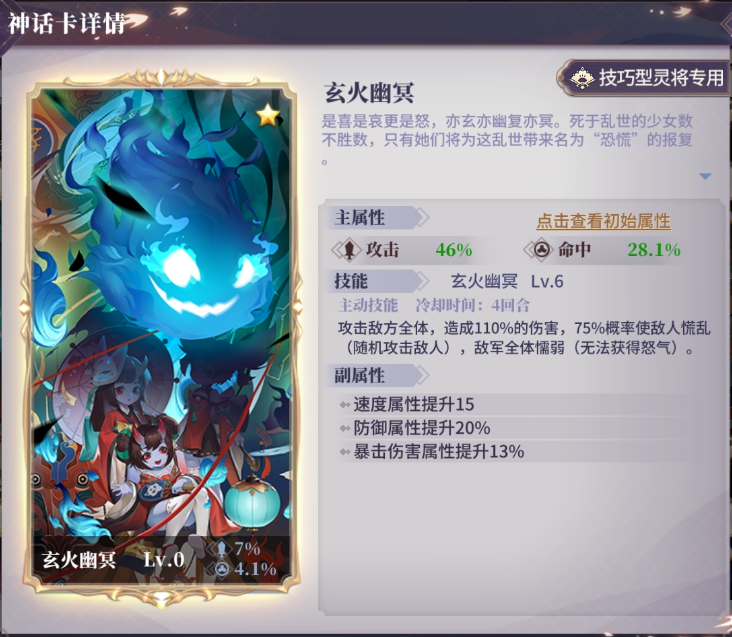 玄火幽冥:控制类的神话卡,但是缺陷是主属性没有速度,没办法先手控制,比较适合pve推图使用,pvp效果一般。